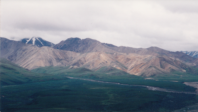 PrologueWe wanted to plan a trip to Alaska to coincide with our third wedding anniversary. We thought that the best of both worlds would be to hike to see the interior of Alaska, and to follow that up with a cruise to see the coast. We found a womderful company called Adventure Alaska which offered an Alaskan Day Hiker Adventure. They drive to various destinations and do day hikes. Accommodation alternated between camping in tents and staying in lodges.We would follow up the physical portion of the trip with a relaxing cruise. I had never been on a large cruise ship before. Craig had been on one in the Caribbean years before we met. We discussed the pros and cons of small ship vs. large ship cruises, and ultimately decided on a large ship, since I had never experienced that before. We booked a Princess cruise from Seward to Vancouver. We sprung for a room with a balcony, as we knew we would want to spend time looking at the glaciers as we cruised through the inside passage. Our anniversary would fall during the cruise portion of the trip. Friday 7/20/01 - ArrivalI worked half a day and Craig took the whole day off. Our flight left Logan Airport at 2:45 p.m., and we had a stopover in Denver. We watched Spy Kids on the flight, and arrived in Anchorage at 9:15 p.m.There is a four hour time difference from the East coast. We took a cab (which cost $18) to Susitna Place bed and breakfast. The scenery was beautiful on the ride. The juxtaposition of mountains, ocean, and city was just breathtaking. It was still daylight, and we saw dads and young kids on the swings at the playground at 9:30 p.m. We met Linda, the proprietress of Susitna Place, and she showed us around. Our room had a balcony and private bath. The common areas were nice...kitchen, dining room, living room, porch overlooking Mt. Susitna, and a den filled with Alaska reference books, magazines, and videos, as well as novels and games. We went to bed around 10:30. I was glad that I had brought eye masks, as I woke up at 1 a.m. and it was still fully light outside! I woke up again at 3:00, and it was finally dark. Saturday 7/21/01 - Saturday Market and Tony Knowles Coastal TrailWe awoke at 6 a.m., and it was already light outside. We showered and went downstairs. Linda was serving a full continental breakfast, and we fixed plates and headed out onto the porch. We had a gorgeous view of Mt. Susitna, and the air was pleasantly cool (in the 50's).We met Lia (from Washington, D.C.), who would be joining us on our Day Hiker Adventure the next day, as well as some other folks from Minnesota and San Francisco. It was very nice chatting with everyone at breakfast. We walked downtown and it started to lightly rain. I have collected Russian nesting dolls since I was around 5 years old. We browsed in a Russian shop and I found a matryoshka that I liked. We purchased it and had it shipped home so that we wouldn't have to worry about keeping it safe for the duration of the trip. We then went to the Saturday Market, which sets up in downtown Anchorage near the water every Saturday during the summer. There were booths with crafts, food, and music. It was a festive atmosphere, and there were clowns, jugglers, and balloon artists. We ate funnel cakes with berries for lunch (like a fried dough but more of a lacey texture). We then saw an Ecuadorian band (Alma Andina) performing Andean-style music. There was a boy selling their two CD's, one which was "upbeat", and one which was "relaxing." We bought the upbeat one. They were very good, and as Craig and I have an interest in visiting South America someday, it was very interesting to us. After the market, we went to Downtown Bicycle Rental to rent bikes for the Tony Knowles Coastal Trail. The bike rental shop had a mural of Fenway's Green Monster, and lots of Red Sox memorabilia inside, which we found very amusing. We donned our raingear and set off on the trail at around 1:30. It is normally pretty crowded, from what we understand, but I think the rain kept some people away. It was a gorgeous trail, which winds for 11 miles, starting in downtown Anchorage, winding out past the airport, and follows the coast to Kincaid Park. It is a bit hilly on the way out. We saw one female moose on the way out. She was about our height, and was eating vegetation to the side of the trail. She was not interested in us at all. We rested for a while in Kincaid Park, and on the way back we saw 5 moose! One was a male, eating off to the right hand side of the trail. I got off of my bike and stood on the other side of the trail from him, for Craig to get a picture. He started walking toward me, and ended up about a foot in front of me. I stood very still and eventually he moved toward the bikes. Craig put the bikes between himself and the moose, and the moose sniffed the bike tires. We waited for him to move before continuing on. It was a bit too close for comfort! Luckily, we didn't know just how dangerous moose were at the time that this happened, our we may have panicked. We finished the trail at 5:30 p.m., and we returned the bikes and called Duane (a local meteorologist whom we had met in Trois-Rivieres Quebec at Rick Wakeman's "Return to the Centre of the Earth" concert). We made a date to meet for dinner the following weekend. Every restaurant was packed, and we were starving. We had wanted to eat at the brewery, but we would have had to wait for over an hour and a half. So we ate at the Solstice Cafe. It wasn't very crowded, but the atmosphere was nice. For an appetizer we had battered halibut nuggets and fries. Craig had salmon chowder and salmon with rice. I had a deliciously spicy buffalo (as in the animal, not the sauce) meat loaf with mashed potatoes. For dessert we had a chocolate baby bundt cake with chocolate sauce and ice cream. We walked back to Susitna Place, arriving at around 9:00. We unwound a bit in the room and then went to bed. Sunday 7/22/01 - Adventure Alaska Day Hiker Adventure - Thunderbird Fal