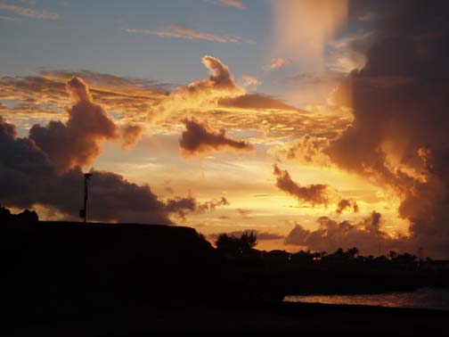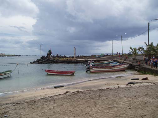 Before we got to enjoy the outdoors too much, we were shepherded inside to a small baggage claim area. We had traveled lightly with only carry-on bags (the rest were stored in Santiago), so we were pretty much ready to go. We were excited to get out of the airport and see some sights. Locals and tour operators vying for business were eagerly waiting to meet with the fresh group of tourists, but we soon realized that they were locked outside of the baggage claim area, and we were locked inside. We were standing around looking out the windows for our transfer to the Hotel Iorana. Outside we saw a woman holding a sign with half a dozen last names on it, one of which was ours. We didn't immediately assume this was specifically us, as the name is so common and there were no first names given. When the doors were unlocked and we were able to go outside to meet her, we asked if she was going to the Hotel Iorana and she said yes. She put pink flower leis around our necks and we were shown to a van. We loaded our bags into a second van. We were raring to go, but we had to wait for the other passengers, who were now gathering their luggage. Once the van was full, we started driving. The ride to the hotel was less than five minutes, and we chuckled at the fact that we could have walked to the hotel and arrived there about half an hour earlier. The woman introduced herself as the owner of Rapa Nui Travel, a company which offered both English and German tours of the island. We were a bit confused, as we had been told that the Easter Island portion of our trip would be handled by Latitud 90. She went on to say that our first tour would be of Orongo the next afternoon at 2:30. Our itinerary had said that we had a morning tour of Orongo. Were we with the right company? We decided to just go with the flow. We were dropped off at the hotel with two other people from the van, two Swiss men. The lobby of the hotel filled its own small building. There were couches and coffee tables, a check-in desk, a gift shop, and a display case full of a collection of souvenirs from around the world. We checked in and were given the key to room number 6. The hotel was a sprawling series of one-story wings. Our room was nothing special. We would come to call it the sweat lodge, as it was quite hot and had no air conditioning. There was a sliding glass door which led to a tiny patio that overlooked the ocean, but there was no screen door. We figured out that we could get a nice cross-breeze if we propped open the main door and the slider. This made the room become a wind tunnel and really cooled it down. The decor of the room seemed very dated, from the yellow draperies to the wood paneling to the "magic fingers" coin slot on the wall above the bed. The view from the patio really was nice. The hotel was situated on a peninsula, and we had a nice view of palm trees and volcanic shoreline. Our room faced the direction of the airport and you could see the signal towers. Air traffic is so sporadic, though, that being near the airport wasn't a problem. In fact, it was comforting to hear a plane take off or land now and then. Once settled, we read the binder which contained the "directory of services." It was essentially an extended list of what you are not allowed to do. Some of this was probably a translation issue. The Spanish section seemed more polite and the English section was definitely more harsh (e.g. $10 fine immediately assessed if you put any of your own food or drinks in to the mini-bar). Mini-bar? What mini-bar? There definitely must be other rooms which were more fancy than ours. Other rules involved not letting guests come into your room, calling the front desk in order to make any phone calls, always leaving your key at the desk when you leave the premises, etc. The rules would be the basis for many inside jokes over the course of the next few days. It started to rain, and we immediately shut and locked our sliding door, as per the rules. We decided to go into the town (Hanga Roa). It was about half an hour walk, but a quick U.S. $2 cab ride. So we had the front desk call us a cab. The cabbie asked where we wanted to be dropped off, and we didn't have any idea. We said just downtown somewhere. He drove us down dirt roads, which, once downtown, were replaced by a repeating pattern of red brick pavers. The cabbie dropped us at the artisan's market, and was nice enough to give us a photocopied map of Hanga Roa. The market was full of all kinds of Rapa Nui souvenirs. We talked with one of the sellers. It was immediately apparent that the prices here were much more expensive than on mainland Chile. We saw a textile map of the island that we really liked. It belonged to a seller who wasn't actually there, but the seller we had been talking with told us the price and offered to sell it to us for her. The price was pretty steep, and we were hesitant. But it was the only one that they had, and it looked like the kind of thing you might not be able to find elsewhere. So we bit the bullet and bought it, as well as some key chains, magnets, and pendants shaped like the moai (huge head statues). I saw a tie-dyed T-shirt that I really liked, but the price was outrageous ($30 U.S.) and the quality seemed like it might not last more than a handful of washings. There were some other items that we would want to buy eventually (8 inch tall moai statues made of volcanic rock) but this was our first stop, and we decided we'd have plenty of time over the next few days to do more shopping. We walked along the red brick road, and noticed that there were culverts in the road which were covered by concrete slabs. There were some places where the concrete cover slab was missing, causing there to be a nasty, deep pothole in the road We walked down near the water. Here we would see our first small glimpse of what was to come over the next several days: our first moai (the large stone statues for which the island is known). It stood watching