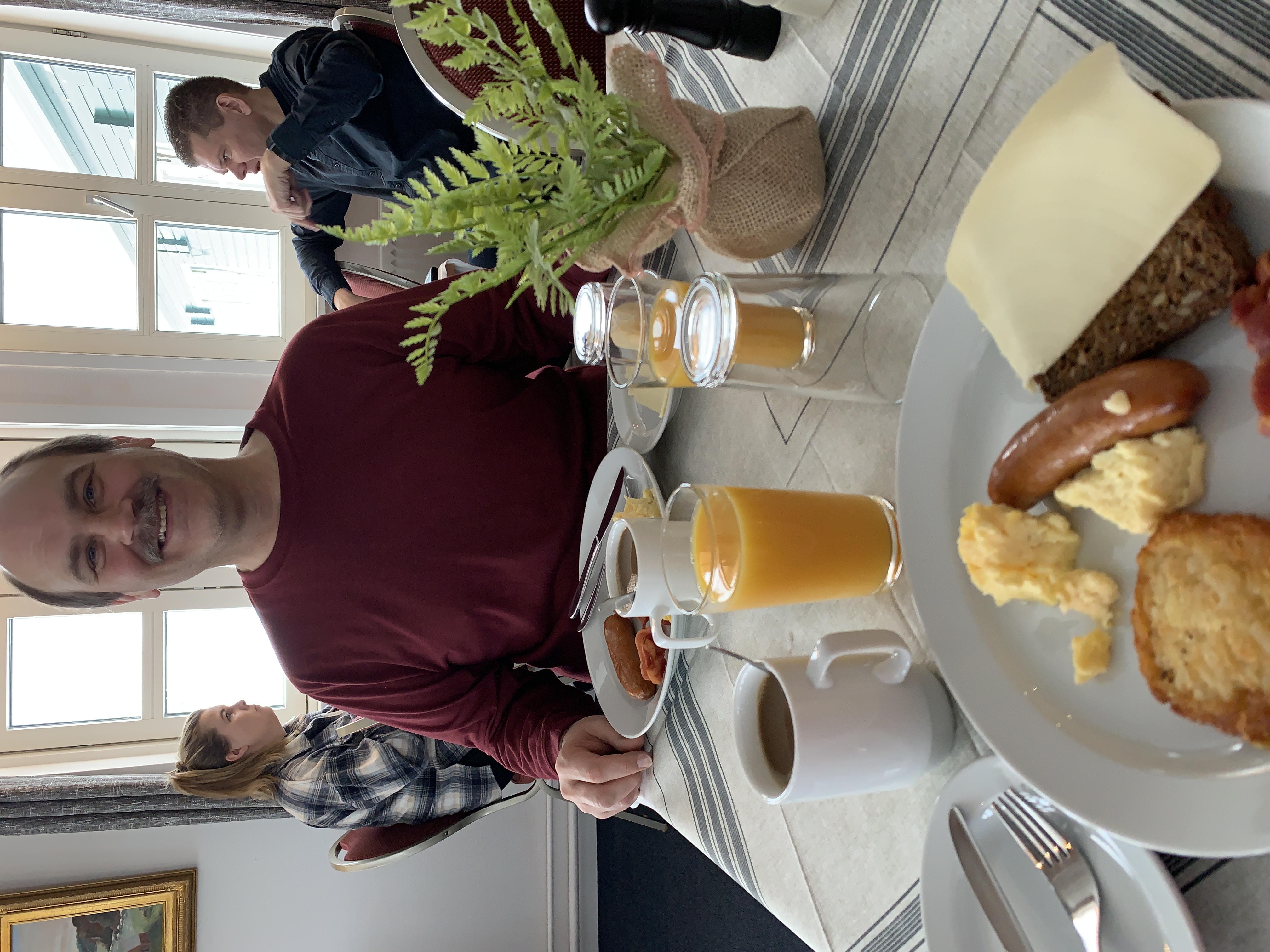 Breakfast at Kulusuk Hote: scrambled eggs, sausage, orange juice, coffee, hash browns, bacon, bread, and cheese