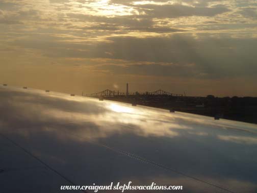 We boarded the plane at 6:20. It was a 2-5-2 configuration, and we were in the 2 seats on the left side. We saw some boats out the plane window and Craig got a couple photos as the sun was going down. We were happy to be getting out of town, as a heat wave was predicted for the weekend. We had no idea what to expect in terms of weather in Africa, but we knew we could stand to escape the heat and humidity here. We took off at around 7:45. We had seatback TV's and earbud earphones. We got Cranapple juice and then we ate dinner while watching "Vincent", a short movie (TV show?) about a private investigator. It was quirky and entertaining enough to pass some time. Dinner was beef lasagna, green beans, a roll and butter, and salad with dressing. We then watched an old episode of "King of the Hill" where a woman in town tries to ban Halloween. The plane stats showed our altitude as 37,000 feet and the outside temperature as -63 degrees F at 3:30 in the morning. We both slept a little, and the flight went by very quickly. Before we knew it the sun was showing itself. We got a picture of the sunrise as we were served a nice breakfast of croissant, jelly, orange juice, and tea. We watched a few short TV programs about FIFA soccer (it being World Cup time and all) and hotels. A woman sitting near us was spraying an excessive amount of perfume onto herself. Quickly it spread through and fumigated the entire plane. Craig, who is quite susceptible to smells, was thrilled. Yuck! What do some people think when they are in an airplane anyway?