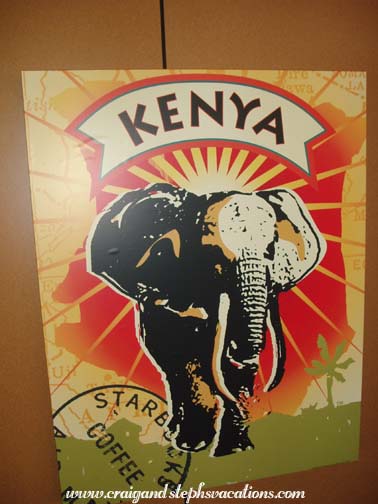 I worked half a day and Craig worked from home. At 3:00 pm we headed over to Craig's parents to say goodbye. At 3:30 we headed into Logan Airport. I got off to a good start by smashing my head on the roof of my mother-in-law's car as I got in to the back seat. My head was killing me. There was a lot of traffic and we saw the Logan Express bus stuck in said traffic trying to get out of the city. That was another option for getting us to the airport, and, given the traffic, we were glad we hadn't chosen that option. We got to the airport around 4:00 and waited in line for about 40 minutes to check in. Our bags were checked all the way to Nairobi. The airport had changed around a bit since our last visit and we got food at our Burger King: double bacon cheeseburgers and fries. We only ever manage to eat this type food when we travel, and somehow it has become part of our exit routine. At around 5:05 we headed to the gate. It was very crowded and we luckily found 2 seats together. After waiting a while, I went to Dunkies and bought Craig a bagel with cream cheese and I got a coffee cake muffin. The pickings were really slim. There were two posters hung outside of the Starbucks at our gate heralding the coffee origins they sell. One was Panama and one was of Kenya with an elephant. Although being strict Dunkies fans and not fond of Starbucks coffee at all, I got a picture of it and we took it as an auspicious sign for the start of our trip. We saw a guy with a huge handlebar moustache, and suddenly Craig panicked. This made him realize he had forgotten to trim his moustache before leaving home. That one last thing he really didn't want to forget as it grows quite a bit over a two and a half week trip. He knew that it would bother him for the duration of the trip.