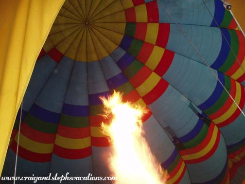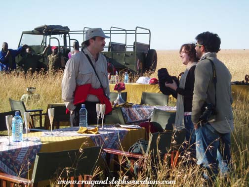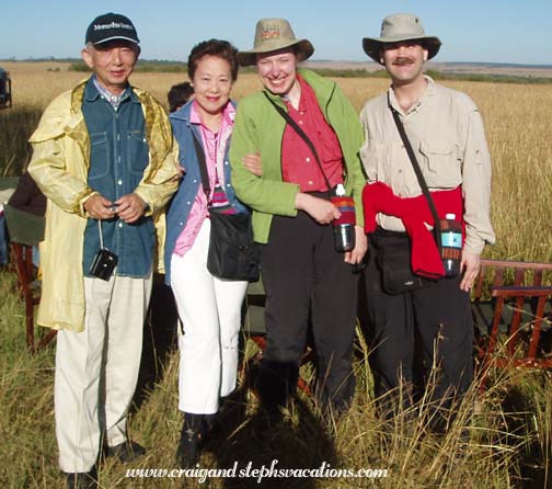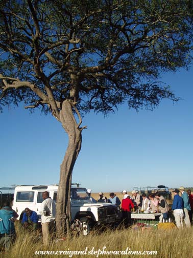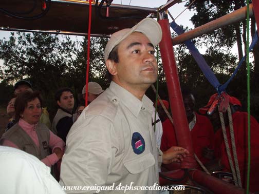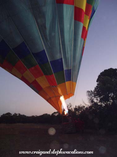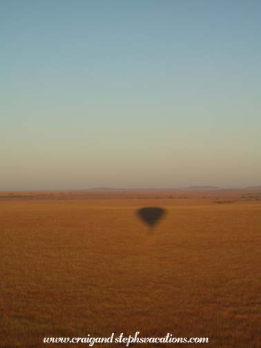 Sammy and Nicholas from Fig Tree Camp picked us up at around 5:05, and when they arrived they insisted that Craig finish his tea. We went outside and got into their large, army-like vehicle. It certainly wasn't a smooth ride. The thing drove like it had no shocks. Every pit, bump, or rock in the road was immediately transferred through our bones and we felt like we'd rattle to pieces. The vehicle was hardly quiet while thundering down the dirt road in the darkness. It wasn't moving very quickly either. We would see a car miles behind us and in no time at all it was passing us and then lost in the darkness ahead. We saw what looked like a rufous elephant shrew in the road, some plovers, and a jackal in the headlights. It was dark and rather chilly, so they had the vehicle all sealed up. We arrived at Fig Tree Camp, which was on a little river spanned by a covered bridge, much like the one at our camp. We filled out the paperwork for Adventures Aloft (the Fig Tree's resident balloon company) and made a quick stop at the bathroom. People began gathering. Some folks like us would arrive from far flung destinations, but many more just stumbled into the lobby straight from their lodgings. It was funny that a few of those locals were joking about how early they had to wake up for this experience. Craig and I had already had an adventure this morning, it felt like we had already been awake for hours. Craig had two cups of coffee and some breakfast cake. We sat in the lobby and chatted with a church group from Florida. Apparently, one of the group wanted to bring some extra hot water and tea with them on the balloon ride. She finished her small bottle of water and replaced it with hot water from the coffee maker. She tucked the bottle into her pants and sat back down. In a matter of minutes she let out a small cry and jumped up onto her feet saying "It's burning me, it's burning me!" Immediately she reached down into her pocket to remove a water bottle that had partially melted. The small water bottle was clearly no match for such hot water. As the bottle heated and twisted, it eventually ruptured and began leaking down her leg. She laughed pretty hard once she realized she was ok. It was just one of those early morning things you do before your brain wakes up. At 6:15 they collected us in another large vehicle but it was only about a 5 minute ride to the launch site. The windshield was so foggy that you couldn't even see out of it. As we arrived at a small clearing, the balloon was on its side already filling with hot air. A whole team of men in matching red jumpsuits and hats were setting things up. They looked like oompa loompas or something. Our pilot, Milton, was from New Zealand. He stood in the middle of the huge basket. It had four compartments around the perimeter which held four people each. Including the pilot that was a total of 17 passengers! When I went for my first balloon ride at the Boar's Head Inn in Virginia in 1984, we rode in the largest basket in the country at that time, which held lucky 13. One couple was late arriving and we almost left without them. The pilot really didn't want to, as the balloon would be unbalanced. This would mean we would all have to shuttle in and out until we were balanced again. Not only would this time would be wasted, but he really was itching to take off in time for the sunrise. Right as a decision had to be made the final couple came running up. The group was now complete. We shared a compartment with two Estonians. Before taking off, Milton made us practice landing position: sitting on a little cushion holding onto loops of ropes with our shoulders braced against the wall of the basket. The basket walls were quite high and when seated you couldn't even see anything except the inside of the basket. At exactly 6:30 we began the ascent. It was so smooth you wouldn't even know you were moving if you had your eyes shut. There was a camera hanging from a boom which took periodic digital photos of the passengers. As we glided over the treetops we saw the rooftops of the Fig Tree Camp. We saw an elephant and buffalo. We saw two hyena dens, with a mother and baby running from one den to another. We saw gazelles, a fox, and a lioness with a cub, and two elands. Of course, seeing these animals beneath us, we couldn't help but thinking ahead to what might be lurking in the tall grass when we landed. It was so peaceful gliding above the Mara. All of the passengers were very quiet and the only real sound was the burners igniting. Once they turned back off the quietness was startling. You had a gorgeous 360 degree view of a classic African landscape. Most of the animals looked at the balloon as we passed overhead (especially when the burners were making noise). A few gazelles were watching when one got the inclination to start running. The others all followed suit. The sun rose quickly and prettily. It had been chilly when we had first set out, but with the warmth of the burners at first, followed by the warmth of the sun, we were soon quite comfortable. We saw a male and female ostrich. There were white headed vultures nesting in the treetop. We could see other balloons way off in the distance and the Mara River near the escarpment. It was gorgeous - so wide open. We had thought that with only an hour of balloon time, that it would be over before we knew it. But it was such a relaxing activity and it was so peaceful that time went slowly and we were able to savor the experience. At times we were at a very high altitude. At other times, we were closer to the ground, and could see animals and vegetation quite well. It was quite an interesting perspective; much different than that from the ground in a Land Rover. There was nothing to constrict our movement; no power lines, etc. Our pilot seemed to have ultimate freedom. The shadow the balloon cast on the Mara was breathtaking. The chase vehicle was always within sight. Criss-crossing through the scenery below,