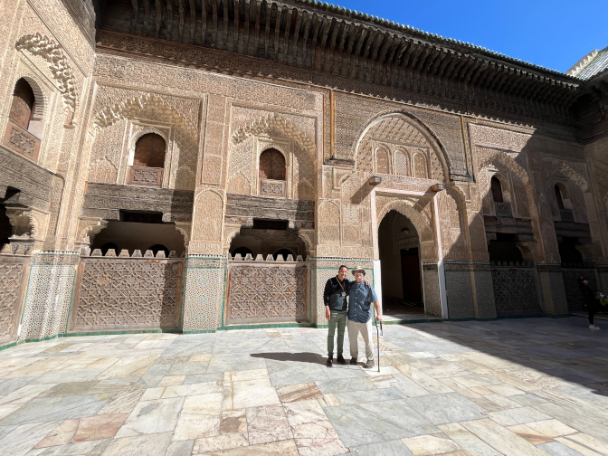 Wednesday 2/21/2024 - Fes: Hammam, Souks, Bou Inania Madrasa, Qaraouiyine Mosque and University, Chouara TanneryAfter a good night's sleep, we woke up at 6 a.m. and showered in the sunken tub. We both felt like ourselves again and were glad that we had chosen to rest up last night so that we could recover. Our stomachs had felt fine after eating dinner last night, and we were looking forward to trying the riad's breakfast this morning.We went downstairs to the restaurant for breakfast at 8 o'clock. They served us fancy cups of coffee with diamond, heart, club, and spade shaped sugar cubes. We had orange juice, baghrir (spongy semolina pancakes, which are only cooked on one side so that the other side looks quite bubbly), msemen (a thin flatbread folded into square pancakes), fruits, avocado, jellies, bread, local cheese, and cake. Craig got a cheese omelette. There was so much food! It was not a buffet, so we realize why they were so shocked when we didn't come to breakfast yesterday morning because our stomachs were ill. Before leaving the riad for the day, we made a 6 p.m. dinner reservation and ordered the lamb tajine. Jamal picked us up at 9:30 and we walked out to where Majid was waiting in the van. Majid drove us to the Palais Amani for our 10 a.m. hammam spa appointment. Immediately, we could tell that the Palais Amani was much more bustling than our riad. There were many more people milling about, gathering fo spa treatments, cooking classes, etc. We saw a large group of people leaving the property for a day of sightseeing. Jamal checked us in and told us that he would pick us up when we were done, shortly before noon. We were seated in a gorgeous courtyard full of plants and fountains, and given mint tea and biscotti. We had a vague idea what to expect from the hammam treatment, since we knew that this is something popular in Morocco and Türkiye which was inspired by the ancient Roman baths. But we know that traditional hammams and tourist hammams tend to be different, and we would be experiencing the latter. We had to laugh because Jamal had told us that our hammam experience would have a "happy ending", and we knew that the connotation of that was not the same as it is in the United States! Craig was a bit apprehensive, as we knew that this was a "steam bath", and with his multiple sclerosis, he is extremely susceptible to heat and humidity. He even fainted after a long stint in a hot tub in Vietnam. At home, when first coming up with the itinerary, we even wondered whether we should book the hammam at all. But it is such a quintessential Moroccan experience, that we felt that we had to try it. Craig would just need to be careful not to get overheated. When it was time for our hammam experience to begin, we were brought upstairs to a warm changing room where we put our valuables into locked baskets. We changed into just disposable underwear bottoms and bathrobes, and were led downstairs to a steamy, wet room. We took off our bathrobes and then were doused with hot water. We sat on a bench and two women put a hair mask of white clay ghassoul, mined from the Atlas mountains of Morocco. They rubbed our arms and legs with a natural rose water and bran scrub. Then we went into a room with a fountain and laid down on benches. It was hot and steamy and we could feel our pores opening as our skin was cleaned. They used a loofah mitt to exfoliate our whole bodies with Moroccan black soap. This is a soap made from olive oil and macerated olives, which has a gel-like consistency and a dark greenish/black color. It looked almost like black petroleum jelly. We would later see it for sale in the souks of Fes and Marrakech. They finished by scrubbing our feet with pumice. They led me back to the bench where we had started, and gave me a cold glass of lemonade to drink. Then I took a hot shower, where I washed off the black soap and clay. I got back into my bathrobe and sat on the bench, where I was given a glass of water. Just as Craig was starting to feel a bit hot and wonder if he should bow out to avoid overheating, his time was up anyway. Then they led Craig out to meet me, and he had his lemonade, shower, and glass of water. They led us upstairs for a couples massage. They gave us a choice of four different argan oils for the massage. We both chose the orange blossom because we liked the scent so much. We had a choice of hard or soft massage. Craig chose hard and I chose soft. I normally would have chosen a hard massage, but my stomach area was still feeling a bit tender, and I didn't want to aggravate it. They covered us in the fragrant oil as they gave us a full body massage. I asked my masseuse to please be a bit careful of my belly area (my stomach made some gurgling noises when she first applied a little pressure), and she immediately backed off and attended to other areas instead. The hammam treatment and the massage was so relaxing, and we came out of there feeling like a million bucks! Everyone was so hospitable and professional. A definite must-do experience in Morocco! Jamal came to collect us, and we met Majid in the parking lot. Craig noticed immediately that there was a dent in the side door of the Mercedes van. It turned out that the van had been hit by a mule cart! Majid dropped us off at the Bab Boujloud (The Blue Gate). This ornate structure dates back to 1913 and marks the main western entrance to the Medina of Fes El Bali (Old Fes). The exterior of the gate is decorated with blue tiles (the color of Fes), while the interior is decorated with green tiles (the color of Islam). Entering the gate, you can see the minaret of the Bou Inania Madrasa, which we would tour shortly. We explored the souks (markets) of the Medina today. They are a labyrinth of narrow laneways where cars are prohibited (though you still have to look out for motorbikes and donkeys!) Some of the alleys are so narrow that when I stood in the middle, my shoulders touched each wall! There were differen