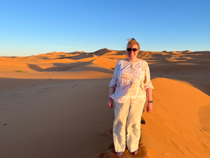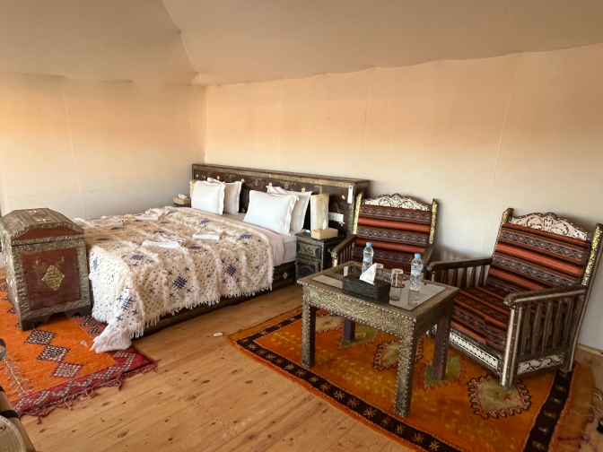 Thursday 2/22/2024 - Fes to Ifrane to Merzouga Desert Luxury CampWe woke up at 6:15 a.m., and Craig made a cup of coffee in the room. We went downstairs at 7:15, and the riad staff gave us a to-go breakfast of water bottles, apples, bananas, and cake. Jamal arrived at 7:25, and someone from the hotel helped to carry our baggage to the car. Most of the city still seemed to be asleep, but various shops were stocking their shelves and baking khobz bread, getting ready for the day. We left Fes in the dark at 7:30 a.m. The sun started to rise just before 8 o'clock while we were on the road.We stopped in Ifrane at around 8:45 to use the ATM and to get a cup of coffee. It is a Swiss-style village built by the French in the 1920's as a respite from the heat in summer and a ski destination in winter. It is located in the Middle Atlas mountains. The fact that it is a little taste of Europe outside the European continent reminded us of SaPa, the hill station in Vietnam. Ifrane's population is almost 100% Amazigh (Berber). Its economy is fueled by tourism (local and international) as well as animal husbandry (raising sheep). Ifrane is at an altitude of 1600 meters and the temperature this morning was -1 degree Celsius. We enjoyed the crisp air, knowing that we would be in the hot desert sun by the time the day ended. We didn't even bother putting on our coats, though Jamal and Majid were bundles up. We sat with Jamal at a restaurant called Green Coffee and enjoyed a cup of coffee. We took a short walk around town, walking through a hilltop park and then getting our photo taken with the statue of the last wild Atlas lion, which was shot and killed in this area in the 1920's. The story goes that the statue was carved by a German prisoner of war during WWII in exchange for his freedom. After stretching our legs in Ifrane and admiring all of the stork nests perched atop people's chimneys and mosque minarets, we resumed our long drive which would eventually land us in the Sahara Desert. This region of Morocco had much more greenery. We drove through the Azrou Cedar Forest. 25% of the world's barbary macaques live here. They live in groups of 30 led by the females. Females live to be 30 years old while males live to 25. They can be thieves.We saw one monkey sitting by the side of the road, but I wasn't quick enough with my phone to get a photo from the car. We didn't really want to stop, as many of these monkeys come to rely on tourists feeding them. They tend to congregate at the road, and this learned behavior is detrimental to their survival. We didn't want to contribute to the problem. Still, we were glad that we had at least spotted a monkey from the car while driving through. As we descended in altitude, the climate became drier again. We passed a motto written on the side of a mountain which reads in Arabic "Allah, Homeland, King". At 11:45, we stopped for lunch in Midelt, a town known for its apple crops. We ate at the Hotel Taddart, which means big house. They had a huge restaurant where tour buses stop for lunch. Most of the patrons were huddled in the warmth of the sunshine coming in through the windows, but we preferred it cool and ate in the center of the dining room, away from the windows. As an appetizer, we had khobz (bread) served with a really tasty and spicy Moroccan chili paste. I was finally feeling like myself again today and had a good appetite. When I saw pasta bolognese on the menu, this was exactly the kind of comfort food that I was looking for. Craig got a trout filet with veggies, the local specialty. We had Coke to drink. By 1:00, we were back on the road. We stopped in Karrandou at around 2:30. The town was having its small Thursday market where the Amazigh (Berbers) of the High Atlas mountains come to trade with one another. Everyone was very friendly, many kids smiled and said a tentative bonjour or gave us a wave. There were lots of things for sale including dates, vegetables, clothing, cell phone chargers, mechanical parts, etc. Jamal pointed out a donkey "parking lot", where donkeys were tied up. We were glad that we got to make this impromptu stop to see a slice of Amazigh life. From the locals' reactions to us, it was obvious that this is not a common tourist stop. We got back into the car and continued our journey. Jamal and I both like to read, and we discussed our favorite books, many of which are in common. He had not read my favorite book, "Catch-22", and given the other books that he mentioned, I thought that he would like it. I would go on to send him a copy once we returned home. At around 3 p.m., we went through the Ziz tunnel and saw the Ziz River gorge. The river was quite low; there has been a 6 year drought in Morroco. Half an hour later, in Errachidia, we saw the Hassan Addakhil dam, which holds 347 million square meters of Ziz River water when full, but at this point the water didn't even reach the base of the dam. At 4:40 p.m., we started to see sand dunes in the distance, and there were small fences to hold sand back from encroaching on the road. We reached Merzouga, which is obviously a gateway to the Saharan dunes. We could see the orange sand dunes shining in the late afternoon light in the distance. There were many tourist companies here was well as fossil shops. Jamal told us that we would be visiting a reputable fossil showroom the day after tomorrow. At 5:30, we reached a hotel where we stopped to use the facilities. The staff offered us a bottle of water, and we told them that we weren't staying there. They smiled and said that they knew we were on our way to the desert camp, and handed us each a bottle of water. This surprised us, but we soon realized that this hotel had a relationship with the desert camp. This is where we said goodbye to Jamal and Majid for the next two nights (we hadn't realized this, but they would be staying in Merzouga town while we were in the desert camp, and we would have local guides while in the desert). Jamal aske