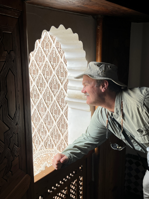 Monday 2/26/2024 - Koutoubia Mosque, Saadian Tombs, Slat Lazama Synagogue, Bahia Palace, Medersa Ben Youssef, Souks, Jemaa el-FnaWe went to the Pixel Room at 8:30 a.m. for breakfast. The lights were dim and it was a pleasant place to sip coffee and achieve consciousness. Breakfast was an elaborate affair, with pancakes, msemen, khobz, fruit, yogurt, pastries, coffee, and orange juice. Craig had a vegetable omelette and I had a cheese omelette.At 10 o'clock, Jamal met us in the lobby and we walked out to meet Majid at the van. Majid drove us to the Koutoubia Mosque. This mosque dates back to the 12th century. It was founded in 1147 by the Almohad Caliphate (1147–1269) directly after they took control of Marrakech from the Almoravid Dynasty (1050s–1147). In 1158, the mosque was rebuilt because they felt that it was misaligned with the direction of Mecca. Remnants of the old mosque are visible on the site. The irony is that it seems that the new mosque is even further misaligned. The minaret is 77 meters tall, and no other buildings in the city are allowed to be taller than it. The mosque is currently closed for renovations due to last year’s earthquake, but they hope to reopen it in time for Ramadan next month. There are four golden orbs (instead of the usual three) on the finial of the minaret. "There are rumors" about how this came to be. One legend claims that the fourth was donated by the wife of Yaqub al-Mansur (the third Almohad Caliph) as penance for breaking her fast during Ramadan. She melted down all of her gold jewelry to create it. Next, Majid dropped us off in front of the Bab Agnaw, one of the 19 historical gates of Marrakech. It dates back to the 12th century during Almohad times. It separates the Kasbah neighborhood of Tamarrakacht from the other neighborhoods of the city. There were horse-drawn carriages taking people for rides around Marrakech, and one went right past the gate while we were standing there. The timing was perfect, and transported us back 900 years. We entered the gate to the Kasbah and admired another mosque, the Mosque of the Kasbah. We saw many storks flying around and alighting on nests that they have built on minarets and chimneys. Next, in the Kasbah, we visited the nearby the Saadian Tombs. This ornate funerary complex dates back to 1557, and houses the graves of the Saadian Dynasty (1510–1659). The Saadians were Sharifs, descendants of the Prophet Mohammed. The tombs are a major tourist attraction in Marrakech, and there was a long line to peek into the most elaborate of chambers, the Chamber of the Twelve Columns. But it was worth it. There was zellige mosaic tilework on the floor and walls, and carved friezes and archways. The zellige on the walls was quite delicate compared to others we had seen. The architecture of the Saadian Tombs reminded us of Mughal architecture in India. To quote the placard on the wall of the tomb complex: It revolves around a cupola which rests on four groups of marble pillars from Italy which support a ceiling of sculpted cedar wood decorated with grand Muqarnas arches. The walls are covered with glazed earthenware crowned with Koranic friezes. The room shelters the remains of the creator of this funerary ensemble Ahmed Al Mansour, and those of his son Zidan and his immediate successors.While walking through the Kasbah, we came upon a Gnawa busker. I was able to sit in with him for a few minutes and he taught me how to play the krakeb cymbals. He had a hat with a tassel and he moved his head so that the tassel spun while he played. We walked through markets where they were selling spices, black soap (for use in hammams), and natural dyes. This area of the kasbah had traditionally been the Jewish quarter, though today it is not strictly Jewish. We visited the Slat Lazama Synagogue. This synagogue dates back to 1492. It has a lovely courtyard and houses several exhibits on Judaism. including a photography exhibit on the Bnei Menashe, a group of people in Northeast India who are believed to have been forgotten descendants of the Jewish people. Next we visited the Bahia Palace, a 19th century palace with exquisite architecture. The palace was commissioned by Si Moussa in 1866. He rose through the ranks from slave to be grand vizier of Alaouite sultans Mohamed IV and Hassan I. Si Moussa died in 1894. He was succeeded by his son Ba Hmad, who expanded the palace and named it after his favorite wife Bahia (meaning "the Brilliant"). It reminded us of a cross between Mughal and Bhutanese design, with mosaic tile work and carvings reminiscent of Mughal India, and ceilings where every inch is painted in floral and geometric motifs, as in Bhutan. This painting style in Morocco is known as zawaq. There were also stained glass windows in some of the rooms. There are many lovely courtyards in the palace. Jamal mentioned that the mirrors and fireplaces inside were added by the French at a later date. One annoyance at Bahia Palace was an influencer and her entourage. They snapped perfectly posed photos of her in all of the photogenic locations, and it was very distracting (not to mention the fact that you had to wait for her to get out of the way all the time). After leaving the palace, I tried to get some money at an ATM, but it appeared to be out of cash. Next we stopped for a light lunch at a Lebanese restaurant called Naranj, which was highly recommended by Jamal. We sat on a shady roof deck and enjoyed delicious falafel wraps with fresh chips and a Coke. We spent an hour enjoying the delicious food before resuming our tour. We walked through the souk and saw a restaurant with clay pots full of tangia, the signature dish of Marrakech, a stew. The restaurant also featured mechoui, slow-roasted whole lamb or mutton that is cooked in an underground clay pit. We peeked into one such pit, though the day's meet had already been extracted. Next we toured Medersa Ben Youssef, a Koranic school built in 1564-65 by the Abdallah al-Ghali