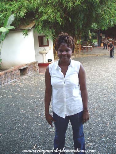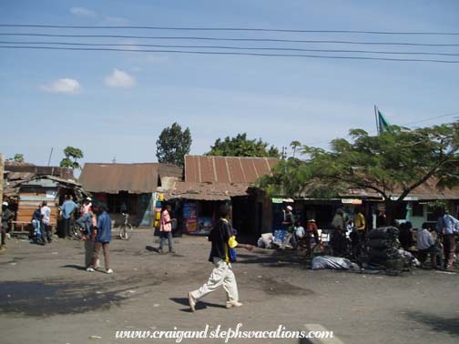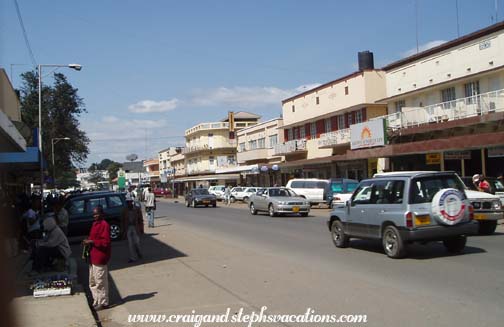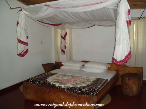 It is always a little sad for us to move from one part of a trip to the next. As excited as we were about gorilla trekking in Rwanda, we wished we could have spent more time at Kambi ya Tembo. The sun was shining but it was very chilly. We passed by each of our Maasai villages, and again we felt the separation anxiety. These people had all been so welcoming; it was bittersweet to pass by as we left. We passed by the road which would take you to Kilimanjaro, and wondered if we would be back to climb it some day. It was supposed to take 2 1/2 hours to get to Arusha, but it took 3 1/2. Michael wasn't the fastest driver, and the open air vehicle was freezing. You could feel the cold breezes flowing down Kili's slopes and straight into your bones. We wrapped up in our Shukas. Eventually I couldn't stand it any more. I leaned into the back seat, where the luggage was, and dug through my bags trying to find something warm. I eventually found my fleece, which I quickly put on. We passed through some small villages: Ngare Nairobi, Sanya Juu (a Chagga town Sylvestry mentioned), Lawate Boma NG'ombe, Tikatiti, etc. In the more rural areas, most kids and some adults waved to us. At one point we picked up James, a waiter from Kambi Ya Tembo, who seemed to be by the side of the road in the middle of nowhere. As we approached Arusha, we passed by large expanses of cornfields. The corn was fenced in and was labeled according to its "lot". We aren't sure who the company was, but it was some type of hybrid genetically modified corn. We wondered to ourselves about whether such a shift in agriculture was beneficial or detrimental to Tanzania in the long run. When we finally got to Arusha, there was a bit of culture shock at first. There was air pollution, garbage on the sides of the road, etc. It was a small city, and unlike anything we had seen in a while. We were getting too used to the bush. We drove down a small side road, past a police station, past a sign for "Happy Sausages Ltd.", down what totally looked like a dead end. But it turned into a nice walled compound, like something we saw in Peru. This was Mama Wilson's. Her house was on the property, as well as some guest rooms, a gift shop, a restaurant, and an outbuilding which served as a business office with internet. There was a nice swimming pool surrounded by lounge chairs. We were shown to Room 4 by Prudencia. It had a big mosquito net tied up over the bed. The bed frame and bedside tables were hewn out of logs. We had hoped to be able to warm up in the room, but it was very chilly and we both wore our fleeces. We had half an hour to rest and then we met Michael in the open-air dining room for lunch. We ate tomato and cucumber salad, bread, rice, stir fried beef, peppers, and onions. I ate what I could but wasn't that hungry. Craig had a coffee (in an attempt to warm up after the cold journey) and I had a Fanta. It was warm in the sun and cool in the shade. The grounds of Mama Wilson's were beautiful. Lots of tropical plants. A maintenance man was refinishing a bureau in the courtyard. He was doing a painstaking job of sanding it by hand. We watched him for several minutes. There was a cat basking in the sun, and we noticed that it seemed much larger and better-nourished than cats we had seen in Central America. After lunch we went for a ride with Michael and James (the waiter we had picked up this morning). They took us all around town. On one of the main roads, in the more touristy areas, there were small restaurants everywhere. They had great names, such as "Atomic Superstar Menu Bar & Restaurant," the "Pepsi Personality Garden," and the "Polygon Triangle Restaurant." There was a place called the "New York Store and DVD Library" and the "Las Vegas Cafe." We saw the Arusha International Conference Center, site of the currently assembled UN's International Criminal Tribunal for Rwanda.No photographs were allowed in the area. We saw a UN vehicle drive by. We saw the clock tower (sponsored by Coca Cola) and then drove down to the industial area. People were walking, riding bikes, driving cars and trucks, and pulling handcarts. Women were selling roasted corn cobs on the side of the road. There was a "General Tyre" that had a huge football field, and everything was brightly painted and decorated with tires. Then we drove through the heart of the city. The old city, as it were. Women were working foot-powered sewing machines, and there were huge food markets (where the food for Kambi ya Tembo is bought fresh every few days). We passed the Arusha Library and stopped at the Cultural Heritage Centre. It was a consignment shop jam packed with gorgeous art. The store was laid out in concentric circles and contained antiques and very expensive (beautiful) art. There was an intricate ebony wood carving that was 12 feet tall and took the artist 14 years to complete. It was beautiful. As part of the gallery was open-air, it was protected from above by electrified fences and razor wire. There were also a couple of rooms which sold less expensive items, and we bought a mask and some Christmas ornaments. Next door they were in the process of building a new Cultural Heritage Centre - a very modern building decorated with a huge representation of a Maasai shield. Michael then drove us back to the hotel and said that someone (maybe him?) would be back to pick us up at 7 am. We went to the gift shop at Mama Wilson's. Prudencia asked us what we wanted to have for dinner; the chef would prepare something to order. Because I was still dealing with a sensitive stomach, we decided on chicken and mashed potatoes. We continued looking around in the gift shop and bought a shuka and a small intricate ebony wood carving. Ebony is a very interesting wood, as it is very dense and heavy, black on the inside, but with a blonde layer around the perimeter. We met Mama Wilson and her friend Jane in the gift shop. Mama Wilson wasn't what we expected. I don't know why, but we had be