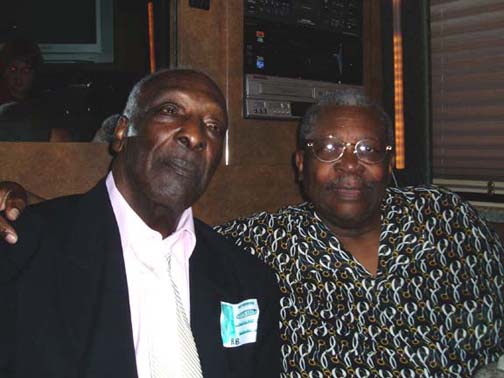 After the show, it was pouring rain. We were told that B.B. would be able to see us, so we were relieved. We walked outside and boarded the bus. We were very grateful that despite not feeling well, B.B. was still being very generous with his time. Our friend Kevin worked for the North Shore Music Theatre at the time, and he was at the show as well. He knew all about our relationship with Frank, but had never met him. So we introduced them, and Kevin was able to accompany us onto the bus. The interior of the bus was very plush and comfortable. B.B. was seated at the back on a leather couch. He had a table with his laptop set up in front of him, and there was a stereo and X-Box behind him. Frank sat down on a couch on the left, perpendicular to where B.B. was sitting. We tried to convince him to scoot over next to B.B., but B.B. said to let the pretty lady sit next to him. Blushing (B.B.'s charisma is legendary on-stage, and in person it is even more powerful), I said thank you and sat. Craig sat on the other side of Frank, and Kevin sat at the little booth opposite B.B. B.B. kept saying "Big Brown, how's Big Brown? You're looking a lot better than you did the last time that I saw you." Frank asked if B.B. heard him singing along. B.B. said that he couldn't hear anything from onstage. It was very cool because it was just the four of us and B.B. It was very hot on the bus, and B.B. apologized, saying he didn't want to melt the lady, but he wouldn't apologize to the men. He called to someone up at the front of the bus and asked him to turn the thermostat down to 75. We are sure this was due to the fact that it was a rainy spring night and he was already sick with a cold. He is traveling with two buses. He keeps the people closest to him on this bus, and there are two drivers for each so that they can travel any time, in driving shifts. While explaining this, B.B. looked at Frank fondly and said, "But he used to do it all. That's why I always take care of him and give him a present." Craig said that Frank really treasures those memories with B.B. B.B. said that they had a lot of history together and have been friends for a long time. "But they weren't only good times. They didn't always treat us nicely." And he suddenly looked serious. He talked about the times that Frank protected him when they encountered racial bias, especially as two African American men driving around the South in a Cadillac! B.B. was grateful that he had "Big Brown" to protect him on the road in those days, and he referenced knife fights and all kinds of dangerous situations. [As a result of this conversation, we noticed scars on Frank's arms which looked consistent with knife wounds.] It was really humbling to witness the massive respect that B.B. has for his dear friend. He is such a down-to-earth man! I had brought a photocopy of the Ernest Withers photo of B.B. and his entourage with his first bus on Beale Street. B.B. glanced at it very quickly, and said "That's it. That's his bus." He confirmed that Frank was indeed one of the drivers pictured. B.B. said that he doesn't fly much any more because it is just too much of a hassle, having to take off your shoes, jacket, and cap, plus checking all the equipment etc. He said they strip you down until you're wearing nothing but underwear. At this point a couple of other people had gotten on the bus. Kevin offered to give his seat to one of the guys who had just arrived, but B.B. said "No, first come first served." I asked if we could get a picture. I snuggled up next to B.B. and he linked arms with me. Kevin took the photo of the two of us, but the flash didn't fire and it came out blurry. I fixed the flash, and one of the other guys who had just gotten onto the bus offered to take a photo of all of us together. We had to squish together to fit in a single photo, and I felt like I was practically sitting on B.B.'s lap. Craig said that he didn't think that B.B. minded. B.B. mentioned that he wished we could sit and chat longer, but he needed to see other people. He joked that the bus was too cramped and maybe some day when he made some money, he'd be able to get one that had room for everyone. As we were gathering our things to go, B.B. said, "While you're here Frank..." and got out a little Sony digital camera. He said that he wanted to take a picture of Frank. Craig and I tried to lean out of the way so that he could get Frank alone in the shot. B.B. said "It would be better with the pretty lady in it." What? OK! So we both leaned in towards Frank and B.B. took the picture. He was pleased with how it came out and showed it to us. Wow, B.B. King took a picture of us!! As we got Frank up and ready to go, B.B. thanked us for bringing Frank to see him. He looked at me seriously and said to take care of him. I thanked him and he said it was a pleasure. It took a while to get Frank up to the front of the bus. The driver helped us to get Frank down the stairs. Another arm appeared from outside, guiding Frank down. It turned out to be Evan Goodrow, the opening act. Craig thanked him, shook his hand, and told him he did a great set. This would be the last time that the two old friends and colleagues would see one another. Frank grew ill in the summer of 2005. He told us that he wanted to be buried in Mobile next to his mother, but he was worried that it wouldn't happen. We promised him that we would see to it that he was buried with his mother one way or another. It was as if that thought gave him peace, and he passed away soon afterwards. Frank's Passing: 8/10/2005On Wednesday August 10, we got the call from the nursing home that Frank had passed away peacefully in a chair in the TV room. We made a few phone calls and headed down there as soon as we got the message. The nurses had not let Frank leave yet; they had kept him in his room so that we could say goodbye. We were left alone with Frank and we said goodbye and told him that we would see him in Mobile. One way or another,