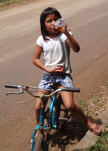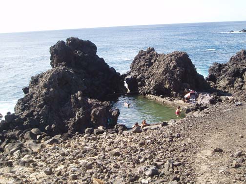We took a cab into town and went to the artisan market that we had visited on our first day. Now we had more of an idea of what the island had to offer and how much things cost, so we felt we could do some informed gift shopping. We bought some magnets, small moai replicas made of volcanic rock, and a replica Rongo Rongo tablet. We really liked the wooden kava kava carvings, but they were just too expensive. Next we went to the post office to repay our 100 peso debt. While in line, we saw the clerk stamp a guy's passport with three special Rapa Nui stamps for $1. We decided to each do this, and the passport stamps were very cool. We also bought two postage stamps for Craig's collection. We decided to walk back to the hotel rather than taking another cab. We took the coastal trail back. We passed some moai, the Chilean Armada headquarters, a sign post with mileage to major cities, etc. Next we reached Hanga Piko, a small harbor where fishing boats go out. We saw some men getting into kayaks with outriggers. This is also the site of Ahu Riata, which holds a single moai. When we got back to the road, we went to a gas station convenience store. Craig got some Escudo to bring back to the room. We also bought some Triton cookies (like Oreos) and I bought a Coke. We walked along the road back to the hotel. It was quite hot and the Coke was refreshing. As we neared the hotel, a little girl rode by on a bike. She was hot and tired, and she stopped when she reached us. She pointed to my Coke and said "Coca-Cola?" I gave it to her and she took a long sip. I asked if I could get her picture, and she nodded. As I adjusted my camera she saw the opportunity for another long sip, which she enjoyed. After I was done with the photos, she finished drinking and handed the bottle back to me. I told her she could keep it. She smiled and pedaled off, waving and saying "chao". What a perfect Coke commercial this would have been! She was adorable, and we felt really happy to be able to share with her. We soon reached the hotel. We went to lunch and ran into Romaine and Bill. We took their picture and chatted for a few minutes (they were eating inside and we were eating outside). We told them about the passport stamps at the post office and they seemed very interested. They thanked us for telling them about it. We went back to our table and ordered. I got the spaghetti bolognese again. It was a much bigger portion than last night's dinner portion, and this time it came with a roll and grated parmesan cheese. Craig got tuna in Spanish sauce. We shared a side of fries. After lunch we rested in the room for a while. We propped open the front door and opened the back slider, so the room was now more of a wind tunnel than a sweat lodge. Since it was so close by, we decided to walk back to Ana Kai Tangata cave. There were a few other people there, but eventually they left and we were alone. We looked at the rock paintings and took a few pictures. We continued down the trail a bit and found an even bigger cave. There was really no safe way to enter it, so we admired it from above. We walked back to the room and changed into our bathing suits. We were very hot, and had considered going into the pool. But on our walk to Ana Kai Tangata, we had seen a saltwater pool built into the rocks on the shore. We opted for the latter. The rectangular pool had been built with volcanic rocks, and it had a retaining wall which overlooked a very choppy area of water which would fill with water, thrash around like a washing machine, and then empty out. The water level would drop by about 10 feet. It was an amazing sight. It was like watching a mini flash flood. We saw a crab ride the surf and end up on the walls of the pool. The pool was shallow and very calm. It was a much better place to swim than the rougher seas on the rocky coastline. Families were there, teaching young kids to swim, etc. There was also another couple who was engaging in the Chilean art of public displays of affection. After our swim, we headed back to the room to shower. Tonight was Terry's band's performance at Te Moana, and we wanted to get there early to make sure we had time to eat and could get a table, etc. As our cab arrived, Bill and Romaine pulled up with their driver, and we all waved to one another. The cab dropped us at Te Moana. As we were pretty early, we went to an internet place a couple of doors down and sent an email home (20 minutes cost 1100 pesos). Then we went to Te Moana. It was empty. Terry had said that the band sets up near the bar, so we got a table in that vicinity. Craig drank Escudo beer and I had pineapple rum, remembering that I wasn't a fan of the pisco sours at this restaurant. We each ordered steak with sauteed potatoes, which came with barbecue and pepper sauces on the side. It was very good, and we ate slowly. Terry showed up with his 6 year old daughter Nua Isabela for sound check. He laughed that we were there so early, but we could tell he was happy to see us. He said goodbye and that he'd see us later. We ordered guava ice cream for dessert. They were playing CD's, and one song that came on was Sting's "They Dance Alone", a song about the torture and repression in Chile under Pinochet. It seemed poignant to hear it here. The place remained pretty empty until the next plane arrived, but by 11 o'clock it was hopping with both locals and newly-arrived tourists. The pace of Te Moana is such that even though we were there for hours, it took about that long to get done with the meal. Terry and the rest of the band (drummer and another guitarist) arrived. We met Terry's wife Kim, an American. Their four children were at the baby-sitter's tonight, and you could tell that they were enjoying their night out. Terry played guitar and sang, and it was a mixture of traditional Rapa Nui music, blues, etc. Terry's wife sat with a group of veterinarians who were on the island to spay and neuter cats. They chatted enthusiastically about the w