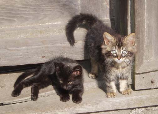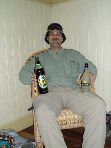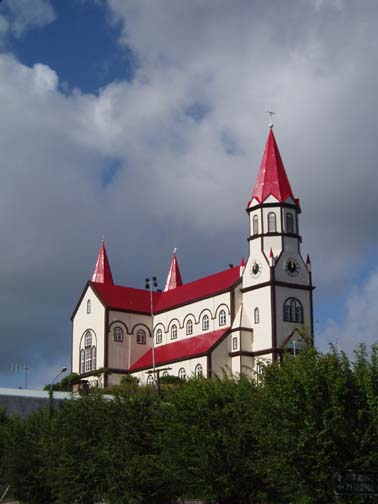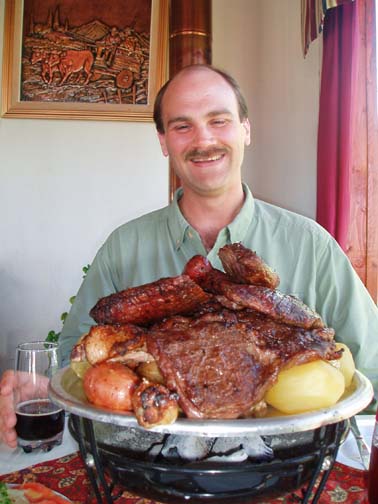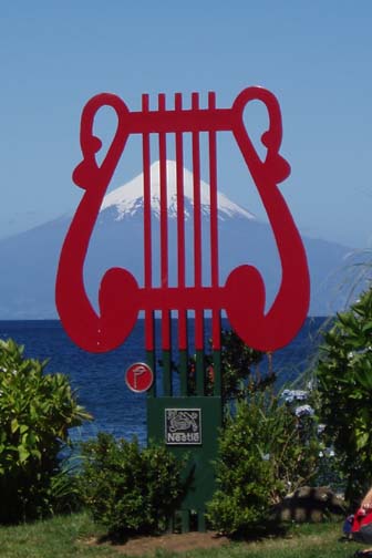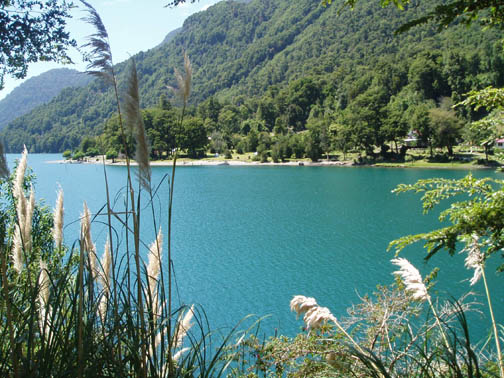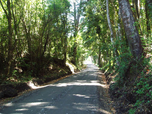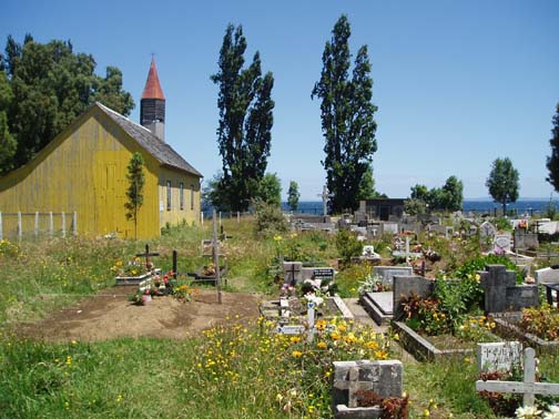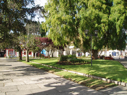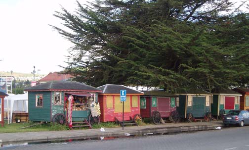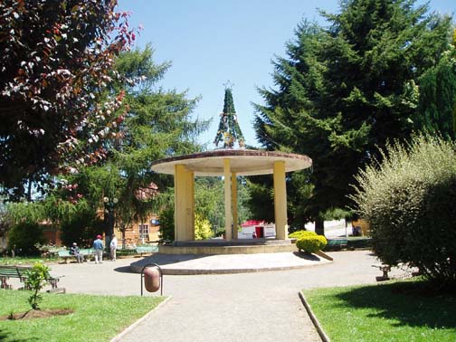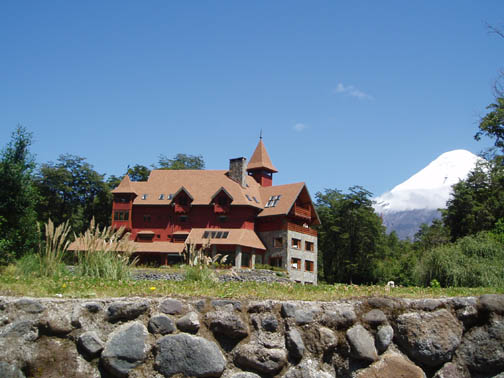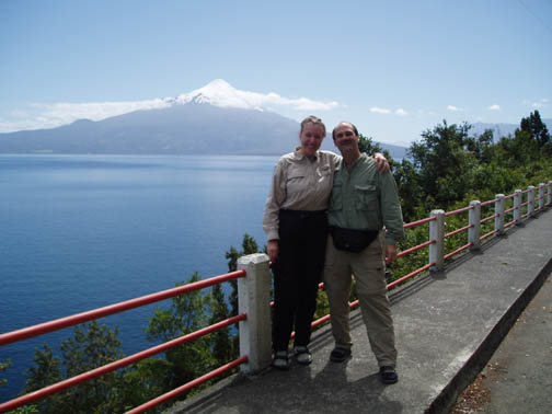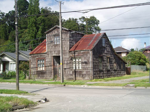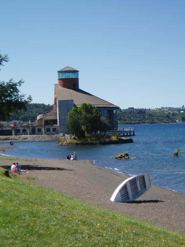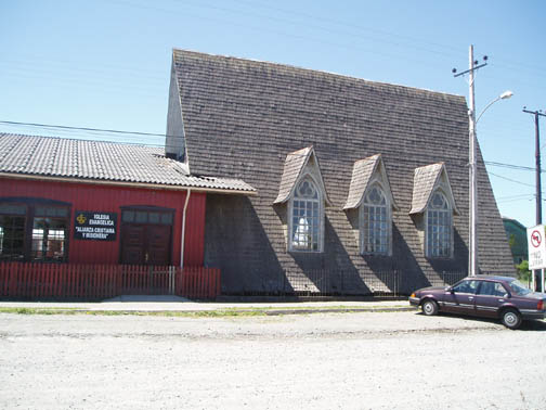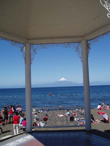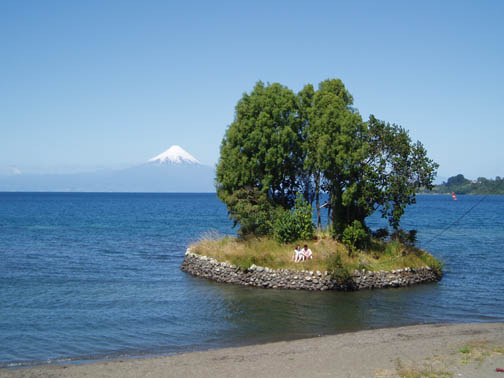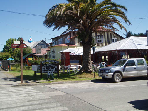 After breakfast we sat on the couch looking at maps and brochures. Vicki came by to see if we had heard anything about the possibility of going to Chiloe this morning. As she was the first person we had spoken to, we said no. She suggested that maybe we might want to rent a car and either drive to Chiloe ourselves, or drive around Lago Llanquihue, the fourth largest lake in South America, whose name means "submersion" in the Mapuche language. Craig was a bit apprehensive about driving in Chile. He was concerned because it was our first day in the Lakes District so we didn't know the area at all, never mind our lack of Spanish speaking ability. Vicki assured us that it would be easy and we would be able to find our way around comfortably. She told us that she usually recommends this option to visitors as it allows them to see exactly what they want to see. Vicki made a few phone calls and found an excursion van leaving for the town of Ancud on the island of Chiloe in a few minutes. It would also be stopping at a penguin reserve on Chiloe. We could go with them if we made the decision immediately. All of a sudden we were put on the spot, and we made the rush decision that we would go. We could be ready in a few minutes and the day would be packed with exciting activities. We ran to our room to get our daypacks ready while Vicki called them back, only to find that they had already left without us. So, the choice was made for us: we would rent a car afterall. The only catch was that the car wouldn't be ready until around 11 o'clock. Vicki was rushing around the house to get to town to meet some food editors from the United States (she is a caterer and owns a gourmet shop in Puerto Varas in addition to owning the Guest House). She offered to drop us off at the car rental place if we could leave immediately. So once again we were rushed even though we had hours to spare, so we grabbed our bags, and hopped into her car. Craig noticed a smell of fish in her car and guessed what they were making for dinner. At this point our heads were spinning as what had started out as a low-key morning suddenly turned into a frantic dash. Vicki drove us the short distance into town and dropped us at the rental car place. As she drove away, we went in and discovered that none of the employees spoke English. They called their manager and put Craig on the phone with him, so that we could get the necessary information. It was now only 9 o'clock, and the guy told Craig not to worry, that the car would be there by 11. So, that left us with two hours to kill. This wasn't a problem as we were new to the town and this gave us an opportunity to explore. We spent this time wandering around town, although we did find it amusing that we took the ride with Vicki and still ended up getting the info through the phone. The rental place was located just off the main square and it was full of very pretty trees and flowers. In general the town was neat and tidy with roads in an easy-to-manage grid. It mostly consisted of shops, small restaurants, and adventure excursion outfitters. We walked over to the shores of Lake Llanquihue, and looked at the volcanoes off in the distance. The surface of the lake was rather dark as the skies were still full of morning clouds. A fisherman was rowing his way to shore and the whole lakeside vision was very serene. As we looked toward town again there was a cute line of little shops that were made up of wooden cars and looked like a gypsy caravan or a circus train along the roadside. One or two shops were open but the rest were all still closed down. Since it was Sunday morning, nothing was really open yet. We decided to walk through the town back toward the Guest House. The church we saw yesterday was near there and we knew that we would find lots of activity there this morning. The Iglesia Catolica of Puerto Varas is an impressive and memorable structure. Made of lightly corrugated white sheet metal with black trim and a red roof, it had the style of a Swiss castle, with three turrets, one of which housed a clock which perpetually pointed to 12:00. Parishoners were gathering for Sunday Mass, some on foot and others driving cars. The morning was shaping up to be a nice day,and we walked around the outside of the building taking a few pictures of the church, as well as some pretty flowers blossoming on the grounds. At one point one of the nearby dogs decided that he didn't like us taking photos and began barking wildly. To avoid causing a commotion we decided to move on. Even after wandering around the town, we still had a lot of time to kill before the car would be ready, so we walked back to the Guest House to take care of some things. We asked Isabel about the possibility of doing laundry. She handed us a large wicker laundry basket. We filled it and gave it to Sylvia, who would run the laundry while we were out for the day. We made sure we had everything we wanted for the day (it had been such a mad dash to get out of here this morning that we weren't sure that we were fully prepared). Once we had everything ready, we walked back to the car rental place. We passed an abandoned house with two tiny kittens on the doorstep: one tiger and one black. The black one was laying partially under the closed door. The gap under the door was just large enough for the kittens to crawl underneath and they looked so cute lying there. I took some photos and found myself so thrilled with the sight that I stepped off the curb without paying much attention and almost walked right in front of a moving car in the process. As we continued down the street we were heading down a hill overlooking the city. The view was beautiful with all the small wooden homes in the foreground, and the lake and volcano towering in the background. This really is a lovely part of Chile. When we returned to the rental car place, we found that the English-speaking owner and the car had arrived in our absence. We were shown to a silver 2