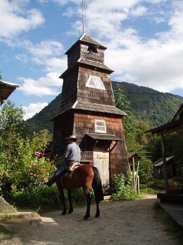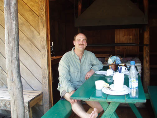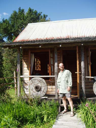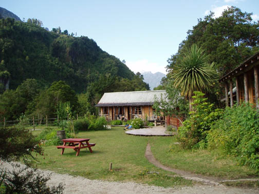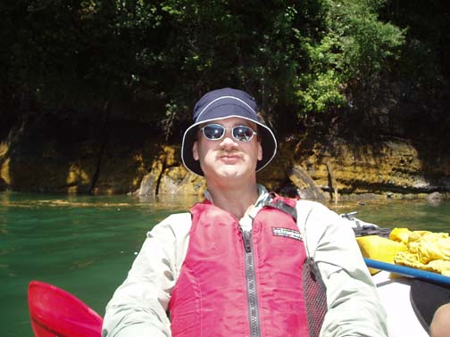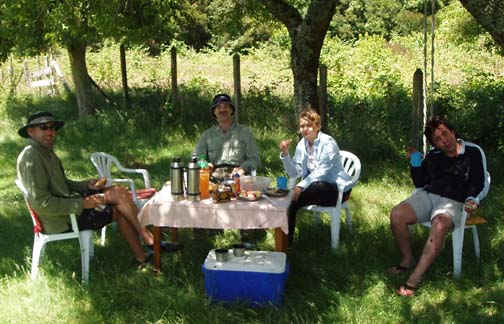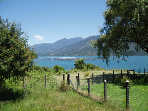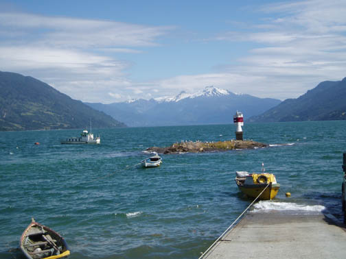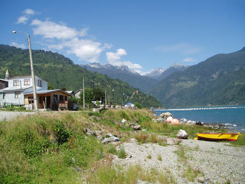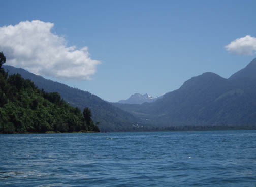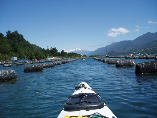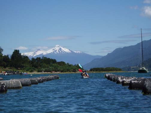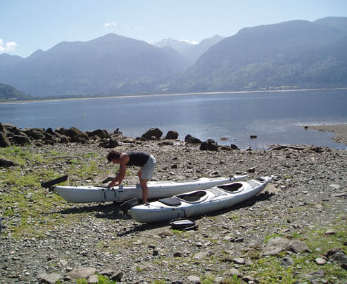 At 9:00 a van emblazoned with "Ko'Kayak" signs on the door pulled up out front. There was Alex, the Chilean driver, Peter, the Irish guide, and Miriam, a German tourism student doing an internship at a hospedaje in Puerto Varas. We could tell immediately from Peter's sense of humor that this would be a fun day. We spoke to Miriam about Germany, and told her about our recent trip. When we said that the impetus behind the visit was a Tom Waits concert, Peter surprised us with a gravelly-voiced recitation of some lyrics from "Martha" and "The Piano Has Been Drinking". We drove along the lake to the gear house in Ralun, and Peter kept us in stitches the whole way. The gear house was a nice new shed built along the main road. Peter was talking to us about how expensive the land was becoming along this stretch. He said that the prices of any property that had a water view was significantly higher and he was concerned about the local people being able to maintain their family land with such an influx of rich new owners arriving. Once inside the gear house, we were issued neoprene booties, spray skirts, wetsuits, rain jackets, and drybags. Alex and Peter loaded up the van and informed us we might want to make one last bathroom stop before we head out again. He gestured across the property and said that we could find a nice outhouse over that way. The three of us headed over and there was a nice little building with a porcelain toilet inside. It was rather amusing though since there was absolutley no light inside and since it was a quality built building there was no ambient light. It took a few minutes for the eyes to adjust but eventually I could see well enough to take care of business. Stepping back outside into the bright light was rather shocking at first but I soon adapted to the change. When we returned to the gear house we were ready to go. Hopping back into the van we continued along the lake following our path from yesterday. Near Ensenada Peter pointed out something we had missed the day before. On the left side of the road along the lakeshore there was a rather large campground and a few small guest houses with lots of children standing near the street. On the right side of the street was a nice park with all sorts of children's games. Peter pointed out how the little children had to cross this very dangerous roadway to get back and forth to the park. Peter asked whether or not we thought the designer actually wasn't very fond of children at all. We continued driving all the way down to the cut-off road near Petrohué but this time stayed to the right of the fork in the road. Now we were in new territory. Driving down a rather bumpy dirt road, with tall trees flanking either side, we continued until we reached the put-in point on the Reloncavi Fjord. Peter and Alex gave us agua gasificada (carbonated water seems to be very popular in Chile, though neither Craig nor I like it), nuts, and chocolate energy bars. Here we were officially introduced to the tabanos, biting black flies that we discovered yesterday could really make a day difficult. They swarmed around us on the beach and continually tried to land on us. They seemed to really like Alex and we noticed at any one time he would have quite a few that had landed on his legs, his arms, and his head and were occasionally biting him. Craig smashed one off his right leg and it fell to the ground ready for more. He stepped on it and it didn't seem to make a difference as he managed to squeeze between a few rocks. Craig then rolled a rock onto it and stepped on the rock. Next thing we knew it was crawling out from under the rock ready to attack again. These things were like some sort of killers in a movie or something. Craig finally crushed it dead as dozens more followed suit. Peter said that it is our job to kill as many of these nasty creatures as we could but we'd notice it makes no difference as they are quite hardy and quite plentiful too. We asked if they follow us out onto the water and he said "Oh yes, they seem to be able to fly for hours over water and that won't stop them". Oh joy we thought. He insisted we would get used to them and learn to ignore them buzzing fiercely in our faces. Peter dubbed Craig and my kayak "Team America: World Police" after the satirical movie which had recently been released, and his and Miriam's kayak was "Team Europe." Peter wanted us to get into the water quickly as the fjord was filling up. He warned us that we would spend the day going against the current and there were a few places he wanted to make sure we got through safely. I was in the front of the kayak and Craig was in the back. Peter then told us that Alex would keep our daypacks and he would drive along the fjord keeping everything dry and safe. We had no idea this was the case and if we had known, we might have decided to bring a few extra items with us on this leg of the journey. Alex told us that he would also continue ahead and set up a nice lunch further along the journey. This would be nice since Craig was already starting to feel a little hungry and we had lots of work to do before that time would arrive. We put on our neoprene booties and spray skirts and got into the kayaks. We put our few belongings and our camera into the dry bags. Peter told us we would have a few opportunities for photos and that we could stop and get it anytime but he said that the fjord being saltwater he didnt want us to risk keeping it handy. We didn't wear the wet suits or rain jackets as it was quite warm and sunny. Good weather for kayaking, but clouds might have been nice to help keep the tabanos away. As we paddled around a bit getting used to the kayak and enjoying the amazing scenery around us, Miriam and Peter got in the water and joined us. Our first challenge was cutting across the fjord. We needed to eventually get to the other side and Peter recommended that we do that right away as the current would only get worse. Paddling hard, we work