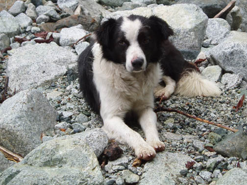 We met our horses. Craig's was named Negro and mine was named Temucano. We were given rain ponchos, but we didn't wear them as the rain wasn't too bad. We just suited up in our rain pants and fleeces. The ponchos and the dry bags were strapped onto the horses. Saddlebags full of food and supplies were also loaded up. Two of the dogs wanted to accompany us on the journey. They had to tie the golden retriever up so that he wouldn't follow us. He apparently bothers the sheep along the trail. But the black and white dog named Corbata (which means "necktie", because he has a band of white fur around his neck) was allowed to go with us. He had accompanied Margot, Hannah, and Eva on their journey as well. We were assured that he would be a welcome guest and a great companion.