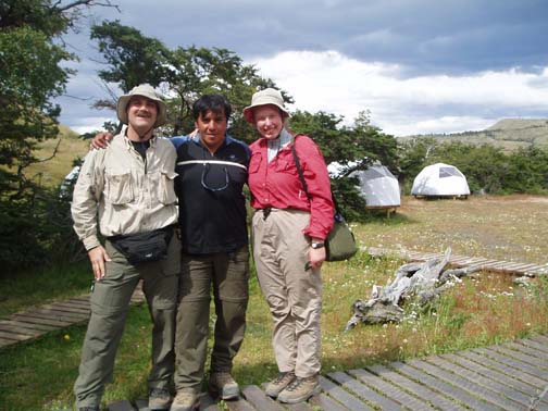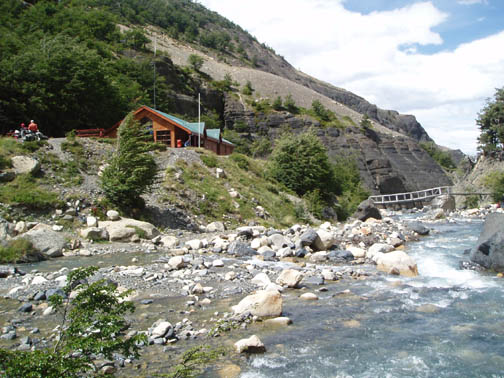 I crossed the bridge at the bottom of the hike. When I got to the other side, Craig and Cristian were busily picking and eating berries from the calafate bushes. Unlike some of the berries that we had encountered during the past few days, these were perfectly ripe and yummy. We made our way through the hosteria grounds. It took us about 3 and a half hours to get back to the hosteria. We stopped at the gift shop and bought maps of the region, a magnet, some postcards, and some ice cream (Craig got a vanilla strawberry sundae and I got a cookie sandwich). They accepted credit cards, so we decided to use ours in an attempt to hang on to some of the harder to come by cash. It appeared easy enough but then took on a life of its own. Well, the woman running the shop had to lock the shop and accompany Craig to the hotel's reception desk in order to get them to run the card. Craig tried to back down and give her cash after all, but the woman insisted it was no problem and that he should follow her. Craig said it was a madhouse in the hotel lobby. There were people trying to catch busses and looking for cabs, others looking for information, others checking in. Some were making phone calls and others were working in a small office behind the main reception desk area. Craig said he tried to call it all off and pay cash, but the woman was on a mission and again insisted it was no problem. There were probably close to a dozen different employees running around trying to take care of all the different needs of the guests. I stayed outside with Cristian and Craig didn't emerge for 15 minutes. Even then, he wasn't done. He just needed his passport number. So he went back inside and finished up. Craig said that eventually the woman managed to get one of the office workers to handle the purchase and write up the credit card receipt. Craig came out of the lobby looking quite frazzled and laughing at the whole situation.