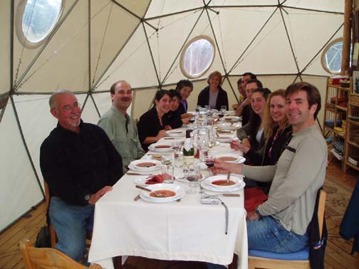We sat at the long table and it became quite breezy outside. At times the domo door flap would open and the wind blowing in was quite cold. It was amazing how well the domo kept the heat in, but it couldn't compete with the wind. It seemed the flap had a problem with its zipper, and the staff managed to get it fixed so it could seal properly. With that minor setback repaired, dinner was brought to the table. We had a delicious tomato-based soup as an appetizer. Craig had red wine and I had white. Word on the street was that dinner would be salmon, and sure enough, the rest of the group was all served a tremendous looking salmon dinner. Everyone was quite excited about the meal and Craig and I patiently waited for ours to arrive as we were served last. As the plates came to the table we were very surprised to see that we were given some meatballs that were like little meat loaves. The meal was actually very good but I think Craig was rather disappointed. He was really looking forward to the salmon dinner, especially after seeing it arrive at every other place setting at the table. By this time a few of the others at the table had already eaten what they wanted, and some of them donated some fish to Craig. It was in a nice cream sauce and was served with spinach. For dessert, we got variations on a theme. Craig and I each had two strawberries and a raisin. Evan had seven small strawberries and a peanut. We all had a lot of laughs regarding the varying meals and desserts and it was a nice way to end the day.