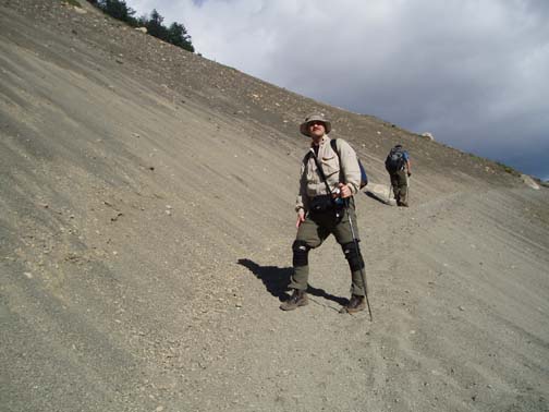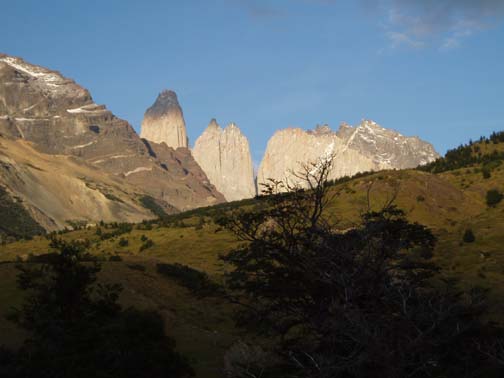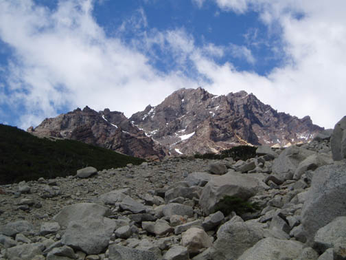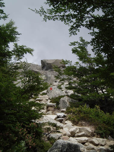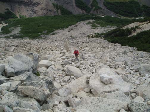 On the hike back down, we passed a lot more people. Craig was very concerned with his knee going down the moraine. He was wearing support on both knees, and hadn't had any problems at all today. He hoped all would be ok and it wouldn't make the return to Ecocamp harder than it needed to be. We made good time working our way down the rocks but I found that Craig and Cristian seem to have no problem stepping from rock to rock while heading steeply downhill with confidence. On the other hand, I felt a bit more apprehensive and took more time making my way along. This is definitely a case where one misstep could make you miserable. As a whole I am gaining much more confidence with this sort of hiking and I'm sure with more experience and more repetition I will be able to improve a lot. In what seemed no time we were back at the base of the moraine and heading into the woods. One last look up the rock slide revealed a very overcast sky that blocked much of the Torres from the viewers. We thought about all the people still hiking up, and how our timing had been perfect. Hikes like this are really fantastic on their own and a view is not always mandatory in order to enjoy them, but we felt so fortunate. We had basically finished up our Patagonia hiking, where the weather is notorious, and always had what we thought was fantastic weather for the circumstance at hand. We were prepared for much worse weather and were blessed with nice weather, nice temperatures, and incredible views for almost all of our days in the park.