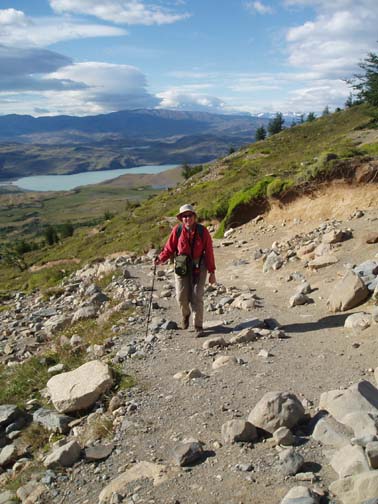 We finished packing our lunches and caught a ride to the Hosteria las Torres. Although it is a short walk from Ecocamp to the trailhead, Cristian felt it was better to save the 30 minutes or so and get going right away. From there we started our hike at 8:00. The first third of the hike was pretty steep getting us up into the valley, as Rodrigo and Juan had warned us. The uphill hike was constant and there was almost no protection from the dangerous sunshine. It was amazing how much the sun beats down at such an early time. There were a few scattered trees along the hike where we could take a quick break to drink some water, but overall there was nothing. The trail wasn't very crowded but we were not alone either. As we made our way up the slope, the trail was wide open and exposed a beautiful view downhill toward the lake. The land here is so big and enveloping that it really takes a decent amount of hiking to arrive at those sights that seem rather close by. After about an hour we had made the initial ascent into the valley. We were right on schedule according to our plan. This was a relief to us as we were in a sort of auto-pilot mode just placing one foot in front of the other making our way up the incline. Arriving at the "peak" we felt it wasn't nearly as difficult as we had prepared ourselves for.