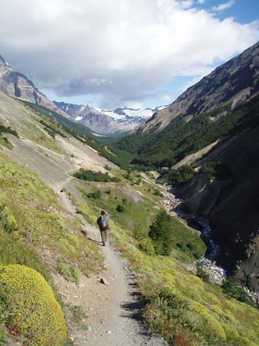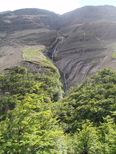 As we continued down the trail, passing many more hikers, we came to a small section where the water coming from the glaciers above would run across the trail. The small stream ran right through a mossy section of rock creating a great curtain of water along the edge of the trail. It was a nice place to fill the water bottles or simply to run some cold water on your face. Soon we were back down to the river's edge and approaching the Refugio Chilenos. As we approached we could see all sorts of hikers around the building and since we had water, had food, and didn't need a restroom, we decided once again to just continue on and not make the detour over to the site. From there the trail starts to ascend the side of the valley, away from the river, and makes its way to the ridge. Here the wind was incredible. We seriously had to be careful to not lose our footing and fall over. The trail was high above the valley and river below and falling off the trail would be very dangerous. Once or twice we actually delayed moving a foot, waiting to make sure we were stable first. The wind at our backs was shoving us up the trail, and we could see other hikers coming toward us walking into this wind. It was somewhat amusing seeing people round a corner becoming exposed to the wind and looking a bit frazzled as they passed by. We were very glad to have the wind at our backs at this point and we were also well aware that the wind was hardly this strong as we were coming this way earlier.