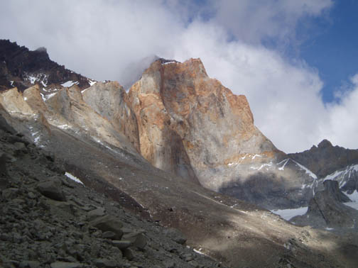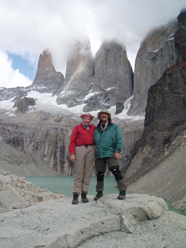 As we turned toward the Torres, the view was phenomenal. We were standing at the top of the moraine avalanche and looking across a glacial lake at the three towers. The lake had that odd blue/green/gray hue resulting from all the glacial silt suspended in the water. As the towers loomed overhead, the clouds playing with the sky made an exciting backdrop. Although the sky wasn't as clear as it had been in the early morning, it looked like we were just in time to have some rather breathtaking views before more serious clouds would roll in. At one point a shaft of light came beaming through the clouds and lit up a section of the middle tower. Cristian managed to get a photo of Craig and I standing in front of the scene, but in this ever changing environment it was hard to truly capture the breathtaking views all around us. Although the lake seemed rather small, Cristian informed us that it was at least another 4 hours of hiking to work your way around the lake and get yourself to the actual base of the towers. He said it was also rather dangerous as there were many glaciers in the area that would need to be crossed. From our vantage point it didn't look like it was very far at all but we knew how deceiving this landscape could be. Only a few other hikers were up at the top, and there was plenty of room for everyone to spread out and feel as if we were the only ones in such a lovely place. We had our own little spot nestled on a large rock. Cristian claimed that it was his rock. We broke out our lunches and had to add a little bit of clothing. The winds up here were pretty significant and suddenly our bodies were aware of the chilly air around us. We added our windbreaker coats to preserve our body heat. As we sat on top we noticed the clouds were definitely getting more dense and we knew that Cristian was right. Getting an early start and keeping moving was a good idea and we felt lucky to have the terrific views we had. Soon after we were settled, Evan showed up. He was the first of his group to make it. They had left about an hour after us, and he had run the second third of the hike (he and Megan are triathletes). Steven showed up next. It was a little chilly at the top so we decided to put our hats and gloves on. Looking down the trail on the moraine we could see many hikers making their way to the top. As the top seemed to be getting more and more crowded, we decided to move on and let the newcomers enjoy "Cristian's rock". We headed back down, and met the rest of the group on the moraine (except for Jane, who it turns out had decided to stay back at Ecocamp for a day of pampering).