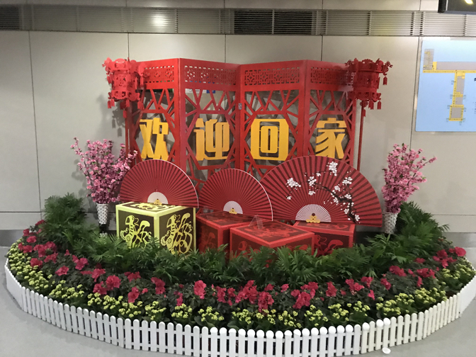 PrologueWe first visited China in 2014, on the recommendation of Toni from Myths and Mountains. She told us about her friend Wang Jun, who is a fantastic guide. Wang Jun works primarily in Guizhou, a southern province, and the tour focused on the ethnic minorities in that area. Guide quality can make or break a trip, and this sounded amazing to us and we signed up. We had a wonderful trip and really bonded with Wang Jun.We enjoyed China so much that 6 months later we returned to visit some of the more popular tourist destinations. At the end of the trip, we returned to Guizhou to visit Wang Jun and get to meet his family, including his wife Xiao Yi and infant daughter Ziting. We also met his mother, sister, and brother-in-law, and reunited with driver Mr. Zhou. Wang Jun and Xiao Yi asked us to be unofficial godparents to Ziting. We were honored, but since their culture doesn't really have the concept of godparents, we weren't sure whether it would "stick". But they seemed very serious about it, and said that we should return in the future to celebrate the Spring Festival which coincides with the lunar New Year with the family. 2018, the Year of the Dog, is when it all came together. Wang Jun coyly told us that he would be putting together a program for us to travel with the family (pretty much everyone in China gets a week off to celebrate the festival), but he kept the details a secret. Monday, February 12, 2018 - DepartureUnusually for us, we left for this trip on a Monday morning. It worked out well, as we had the entire weekend to finish preparations. Craig's brother Steve drove us to the Logan Express bus at 6 a.m., and we arrived at the airport shortly before 7. We checked in, went through security, and enjoyed an egg, sausage, and aged cheddar bagel sandwich at Berkshire Farm Market.The first leg was a short one, flying to Dulles in Washington, D.C. We then boarded a United Boeing 787 Dreamliner for the long haul to Beijing. Craig was seated next to a Chinese man who used a translation device to chat with us. He had apparently been in the U.S. to attend the Grammy Awards, as he had a program book and photos of himself on the stage. We were served a meal of chicken with rice and salad, followed by delicious salted caramel gelato. We zoned out on the plane, listening to Bob Dylan music on shuffle on our iPod. We dozed a little, but not much. Later they came by with a snack: a turkey and cheese sandwich and a small packet of M&M's. Tuesday, February 13, 2018 - Beijing, Arrival in GuiyangShortly before our arrival in Beijing, we were served breakfast. Craig had an omelet and I had apple cinnamon French toast with sausage.We arrived in Beijing a bit early (around 3:00 p.m.) due to a crazy tailwind that carried us east. We had around four hours to kill before our connecting flight to Guiyang. By now we were exhausted and just wanted to get there; so near and yet so far. We decided to get something to eat since we had so much extra time. There was a food court upstairs where you could sit comfortably and eat. There were a variety of choices, and of course we didn't want to eat at Burger King. We saw that there was a My Mill, a noodle restaurant where we had eaten in 2015. At that time we had had a delicious spicy sirloin noodle bowl, so we decided that we should eat there again. Unfortunately, the menu was a bit different. We got the closest thing they had to the spicy noodle bowl (I didn't enjoy it as much as I had last time) along with a Fanta to drink. Our Air China flight to Guiyang left at 8:10 p.m. We were seated across the aisle from Danni, a young woman from Guiyang who had gone to college in Indiana and worked in Chicago for a year. In September, she moved back to China and works at a software company in Beijing. She was returning home to visit her family for the Spring Festival. She was quite friendly, and curious as to why we would be going to China during the Spring Festival. She explained that most tourists avoid that time. Few restaurants or attractions are open, because almost the entire population has the week off. We explained that we were visiting friends and celebrating the festival with their family. She was relieved, saying that she had been worried for us. She was very sweet. We rested on the flight and arrived in Guiyang at 11:30 p.m. We were last off the plane because Craig uses a wheelchair in airports. The distances are too far for him to walk, especially since his legs lock up after being on a plane for many hours. As we went to the baggage collection area, we caught a glimpse of Wang Jun through the glass doors. He excitedly waved to us, but we could tell he was a bit taken aback by the sight of Craig in a wheelchair. After gathering our bags, we exited the airport and greeted him, reassuring him about Craig's condition. We went out to the curb and Craig immediately recognized Mr. Zhou's black van. Mr. Zhou emerged, wearing the New England Patriots hat that we had given him. We gave him a big hug. It was so nice to be reunited with our two friends with whom we had had such fun on our prior trip. As I climbed into the van, Craig said "Be careful!" pointing to the arm rest. On our prior trip, the arm rest on my chair had fallen off, and I had held it up in a bewildered manner. Mr. Zhou started to laugh at the recollection, and Wang Jun didn't miss a beat, saying "Chicken leg!" (They had joked, over drinks that night, that when I held the arm rest aloft, it resembled a chicken leg). God, it was good to be back with these two! At this time of night there was no traffic, and we got to the Poly Hot Springs New Island community where Wang Jun lives in less than 20 minutes. We checked in to a brand new hotel right across the street from Wang Jun's high-rise complex, Hot Springs Mid-Level Hotel. The guys helped us to bring our luggage up, and Wang Jun told us that he and Mr. Zhou would meet us in the early afternoon when Wang Jun gets out of work. This would give us pl