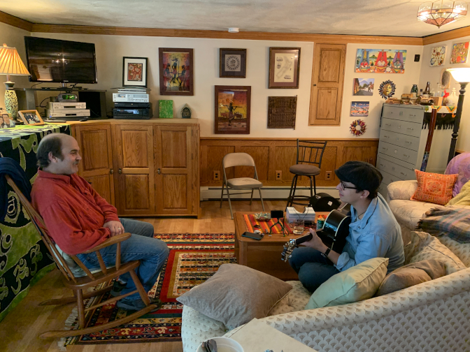 We re-arranged the furniture in the den to make a performance space along the western wall, and borrowed folding chairs and a stool from Lee.