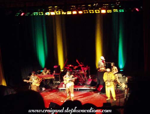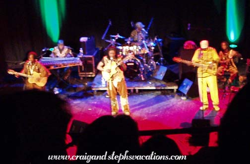 The band was excellent, and played tracks mostly from their latest album, "Afriki". They were dressed in mudcloth outfits and seemed to have a lot of fun performing. Habib sang and played guitar, and he was accompanied by Keletigui Diabati on balafon (similar to a xylophone) and violin, Souleyman Ann on drum kit and calabash percussion, Abdoul Wahib Berthe on bass and the stringed kamale n'goni, Mahamadou Kone on talking drum, doum doum, and caragnan, and Boubacar Sidibe on guitar and harmonica. They played with tremendous energy and enthusiasm. They danced around and even invited some women from the audience up to dance with them. The sound quality was great and you could hear every nuance of each instrument.