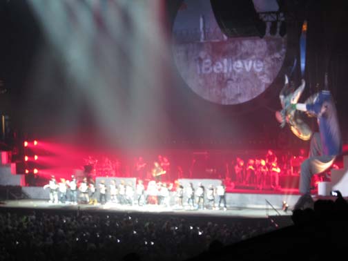 "The Thin Ice" is told as a cautionary tale. Photographs of victims of war and terrorism are shown on the round screen and are then projected onto the Wall, looking like as many television sets as there are bricks in the Wall. It is a nice effect, as it focuses on individuals and then their larger part in the whole context of war. We were amazed by the sound quality in these seats. It had been good on previous nights, but tonight we could really get the effect of the surround-sound.