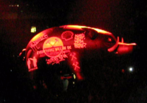 At the beginning of "In the Flesh Part 2", a black inflatable pig with red lit eyes appears from behind the Wall and sails over the crowd. The pig has various slogans and symbols scrawled on it, including the hammers, "Trust Us", and "Drink Kalashnikov Vodka". The first night it was neutrally bouyant and stayed nicely aloft above the crowds' heads. It was flown via remote control, with little fans controlling its direction. The second night it had a hard time staying aloft, and soon had to be rescued by the crew as it kept sagging into the crowd. Hopefully they'll have worked out the kinks before the next show.