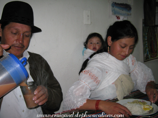 PrologueWe just returned from 2 weeks in the highlands of Ecuador, where a third godchild, Kilhi Sisa, was added to our family.We met Sisa's family last year during a cultural exploration of Ecuador. They live in Morochos, a small rural community not far from Cotacachi and Otavalo, in the Andes mountains. The family has a guest house, and takes in travelers who want to learn more about their community and lifestyle (this is all overseen by Runa Tupari Native Travel in Otavalo). We spent 5 nights with their family last year and became very close with them. They invited us back this June for their annual Inti Raymi / San Juan festival, and asked us to be godparents to Sisa. This was an offer we couldn’t refuse. Our two godchildren in Guatemala (Aracely and Eddy) have enriched our lives so much that we were happy to open our hearts to another godchild and her family. Preparations for the trip had been in the works for almost a year. The family patriarch, Antonio, had never used e-mail when we visited them last year. Our extremely helpful English-speaking guide and good friend Felipe hooked him up with a Gmail account and taught him how to use it to converse with us. Of course there were immediately some cultural differences. With us working in the computer field, we need to plan our vacation time in advance, to give work proper notice of when we will be away. But in the Ecuadorian highlands, things don't move at that pace. The family didn't seem concerned with the details of the trip until about a month before our arrival. Despite the mismatch of planning styles, everything came together fine. We arrived on June 11 (a week before Sisa's baptism, which would be on the 18th) and would stay on until the 27th so that we could experience Inti Raymi / San Juan, which is a combination of Inca and Catholic traditions, celebrating the summer solstice as well as the feast of St. John the Baptist (San Juan). Saturday 6/11/2011 - ArrivalEven though it was a weekend, we woke up at our normal work time (6 o'clock a.m.) took showers, and did our last-minute preparations. Steve came over at 7:45 a.m. We said goodbye to our 4 baby robins in the nest under our deck and of course our cat Brownie, and Steve drove us to the airport. We noticed that the boarding pass we had printed at home said "Priority AAccess."When we got to the airport there was a whole separate American Airlines check-in counter for us. It must have been because we redeemed 70,000 AAdvantage miles each to book these flights. We checked our bags and walked through security with absolutely no waiting. Craig was recently diagnosed with multiple sclerosis, and he needs to give himself a daily injection of medication. With all of the TSA prohibitions on sharp pointy things in carry-on luggage, we expected to have to do a lot of explaining when going through security. Craig had his syringes in their travel case, and he took it out of his carry-on bag and placed it into a plastic bin to to go through the scanner. Nobody stopped or questioned him, so that was a relief. We went to McDonald's. I got a sausage, egg, and cheese McGriddle, hash brown, and orange juice, and Craig got a bacon egg and cheese McMuffin and a sausage McMuffin, hash brown, and orange juice. We got large Aquafina water bottles from Cosi, which we can refill with water from the family's water cooler during the course of the trip. We went to our gate, and saw a woman carrying a promotional tote bag from our work. Small world! The Priority AAccess status meant that we got to board before group 1. Sweet! We were near the front of the plane. We departed ontime at 11:15 a.m. I typed up last year's Ecuador trip on my netbook during the flight. I had a backlog of trips to write up for the web site. We landed in Miami at 2:20 p.m.. We would be departing from the same gate at which we had arrived, so thankfully we didn't have to rush around the airport. I went to Nathan's Hot Dogs and bought us each a Gatorade and a 5-piece chicken tender for lunch. We ate and waited about an hour. Once again we were able to board early. The plane wasn't quite full and we lucked out being able to secure an aisle and window seat with nobody in between us when the woman next to us moved to sit with her friend. The flight took off at 4:21 p.m. Craig ordered a cranapple and the flight attendant called it "Cramapple," which we found quite funny. Craig's legs were crampy on the plane, potentially due to his MS, but his "Cramapple" and the gorgeous view out his window meant that he soon relaxed. We enjoyed a very beautiful sunset; the plane's wing and cloud formations emerging from the cloud "floor" were silhouetted against an orange sky. We landed on time in Quito at 7:15 p.m. We went through immigration and collected our luggage (Priority AAccess status also means that your luggage is the first off the plane, so we didn't need to wait long) and then went through customs. We were all through with everything by 7:45 p.m., not too shabby! We didn't even get outside before we saw the whole family all dressed up in their traditional Otavalan dress. Even little Sisa was wearing the traditional female clothing including head scarf, layered skirts, a delicately embroidered blouse, gold beaded necklaces, coral bracelets and gold earrings. She looked absolutely adorable. She presented us each with a bouquet of roses. She gave us a hug and a kiss and then handed me a bottle of water. We greeted Antonio (Sisa's grandfather), Rosa (Antonio's wife), and Aida (Sisa's mother), and noticed that Aida was carrying little 9-month-old Yupanqui, who had been born on September 23. We were thrilled to meet him for the first time. We all piled into a small passenger microvan for the 3 hour ride back to the community of Morochos. Two large gringos, three Ecuadorian adults, two children, and all of our luggage had to fit in the back of the van, and it was a tight squeeze. I helped Sisa get in and tried to hold her on my lap. But she 