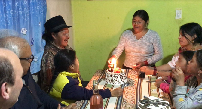 Wednesday, January 16, 2019 - Mukul visits the Alpacas, Antonio's BirthdayFor breakfast today, we had potato pancakes, ham (for the meat-eaters), cheese, bread, juice, and coffee.When we saw Javier on Saturday, he had mentioned that he would be coming to Morochos on Wednesday with a group of his university students. Antonio would be taking them to see the communal alpacas on the mountainside, with a possibility of visiting Lake Cuicocha afterwards. He had invited us to go with him, but we couldn't. I had to work, and Craig was saving his strength for the Galapagos trip. But we thought that it would be a good opportunity for Mukul to learn about the community and Kichwa culture. The alpacas are communally owned, and the villagers share in the wool that they produce. Two trucks and a bus full of university students arrived in the morning. We all greeted Javier, and Antonio and Mukul got into the vehicles with them. They drove partway up the mountain and then walked for 30 minutes up a steep trail to where the herd of 70 or so alpacas are kept. They were shown a demonstration of shearing the wool and filing the alpacas' teeth. In the meanwhile, I worked remotely, and El Señor Chipikins the cat slept on our bed all day, keeping Craig company in the casita. Sisa came home from school early. She had come down with a fever, as Shina had two days ago. Rosa gathered some medicinal plants to treat her. Timing of my work meetings meant that I had to eat lunch in my office: juice, soup, corn, beans, and cheese. Mukul gifted Abuelita a wooly hat which she promptly put on...she looked really cute in the yellow wooly hat. For dinner, we had soup, chicken (for the meat eaters), fries, rice, and red cabbage. Today was Antonio's birthday, and Aida had gone to town to buy a cake. Mukul had purchased some alcohol, and he handed out Pilsener beer and Boone's Snow Creek Berry wine coolers to the adults. They put number candles on the cake...49. This perplexed us, as last year we had celebrated his 47th birthday with Javier and Sonam...somehow things are never as straightforward as they seem. The family sang to Antonio in Kichwa, Spanish, and English. Then they did the traditional Latin American cake face smash, and we all enjoyed the cake. The kids had some Coca Cola and the grown ups enjoyed beer and berry wine. Antonio's Birthday Cake |
