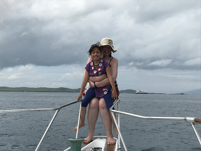 Thursday, January 24, 2019 - Cerro Dragon, SnorkelingWe had breakfast at the hotel: coffee (hot chocolate for Sisa), fruit, scrambled eggs, cheese, patacones, and juice.This morning we got a taxi transfer from the hotel to St. Francis church (which, by the way, contains an awesome stained glass window picturing a pelican). There we met Jorge, our naturalist for the day, as well as a nice couple from Scotland who would be joining us on our excursion to Cerro Dragon. Our original itinerary had called for a trip to North Seymour today, but that island is currently closed to tourists because of eradication of feral cats which threaten the wildlife. We weren't sure what to expect from the replacement excursion, but we were confident that we would have a good time. A bus drove us north across the entire island to the ferry terminal. There we boarded a Zodiac. We thought that this would be our boat for the day (for a hike to see land iguanas and a subsequent snorkel). Imagine our surprise when the Zodiac docked to a full-fledged yacht called the Sea Finch! We cruised west in complete luxury, laying out in the sea breeze. It was so relaxing. I took Sisa upstairs to the wheelhouse (she joked about being drunk due to her sea legs), and we also perched on the bow for a photo op. We could see sea lions swimming alongside the boat, and some hanging out on buoys within the channel. After a little over an hour, we arrived at Cerro Dragon, situated along the northwest coast of San Cristobal. We took the Zodiac ashore. The tide was quite low, which meant for some tricky manouevering of the Zodiac. But we were able to get close enough to step ashore on the jagged black lava rocks. We stood there for a few minutes while Jorge directed our attention to blue footed boobies resting on the rocks, while others dove into the water along with pelicans. We could see a green sea turtle entering and exiting the bay. A marine iguana swam back toward shore and beached himself on a rock to warm up. We had to watch our step on the rocks. Not only was the footing precarious, but marine iguanas and juvenile Sally lightfoot crabs are so well camouflaged (and have so little fear of humans) that you could easily stumble into them if you are not paying attention. It had apparently rained here for the past few days, and the paths through the oceanside lagoons were quite muddy with iron-rich clay. It was very steamy and hot here, so we were fortunate that the sun stayed mostly hidden behind clouds. As we walked around the Dragon Hill, we came across about 2 dozen yellow land iguanas. Unlike marine iguanas, who are more social and tend to hang out in small groups, these are more territorial, and each has its own burrow set apart from others. As we hiked along, we would see a solitary iguana under a tree. Their yellow color is striking, and they are easy to spot against the background of orange clay. Scientists wondered if land iguanas were capable of swimming. Experiments proved that they were not. We couldn't help but think of the panic that was induced in some land iguana which was minding its own business and suddenly got submerged in a water tank for science! Since land iguanas can't swim, they can't regulate their body temperature in the same way that marine iguanas can. So they build burrows and tend to stay in the shade. Land iguanas have been known to mate with marine iguanas to produce hybrid offspring. These offspring are being studied, and it seems that they don't live as long as pure land iguanas (which can live 40-70 years). Sisa was dragging a bit on the hike; it was hot and the terrain was a bit tricky close to the shore. But she did well. On the hike we also observed various birds, as well as mating painted locusts. We took the Zodiac back to the Sea Finch and had some small empanadas as a snack. Our busy schedule was starting to catch up with us, and I felt very lazy. I didn't feel like I really had the energy to snorkel. Sisa also was tired, and had us believing that she didn't want to snorkel either. But when it came time to snorkel, she was enthusiastic. Craig wanted to snorkel too. And I overcame my inertia to join them. We got our gear, and got into the Zodiac. Jorge drove the Zodiac as a support vehicle, and we snorkeled with a diver from the boat. Mukul stayed on the Sea Finch to relax. I had misunderstood and had thought that Jorge would be snorkeling with Sisa. But it turned out that Craig and I were actually on duty. We were glad that she had such good lessons with Fabo, because she was calm and competent when snorkeling with us. Sisa had one arm around my shoulders and we snorkeled through the choppy water. However, the water was way too murky and churned up to see much of anything, so we went back to the Sea Finch. They brought the boat to a second location, and the diver scouted it out before getting all of us back in the water. It was a smart move because it was also too murky there. Third time was a charm and he found some water which was more clear. They gave Sisa a life ring to hold on to and I towed her around. However, at a certain spot we reached a very strong current and I could no longer make any progress. I passed her off to Craig, and we all moved away from the strong current. We saw many different creatures than we had seen on our previous snorkeling excusrions: