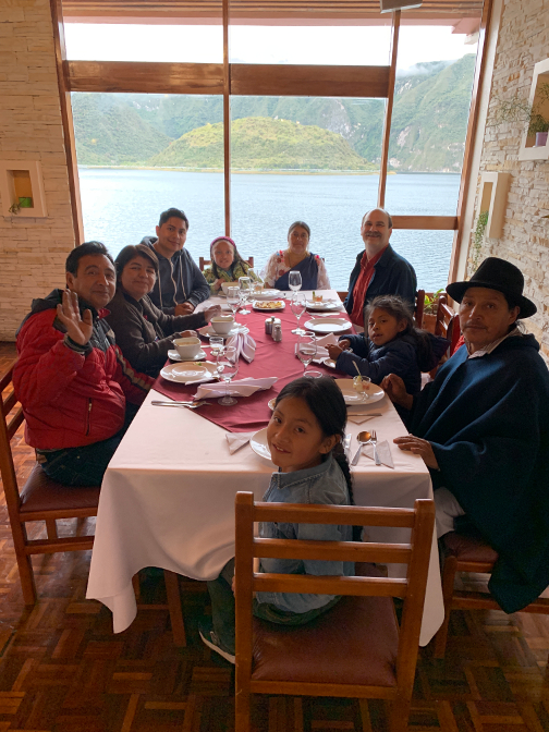 Saturday, November 30, 2019 - A Visit from Javier and Family, Farewell Dinner at Lago CuicochaShina and Yupanqui were at catechism when we woke up. My stomach was still bothering me this morning, so I only ate a bologna and cheese sandwich. Craig had a fried egg and fries as well. We both had coffee and lemonade with chia.They also gave me two cups of special tea from the garden for my stomach. After breakfast, we went to our casita to pack for our departure tomorrow. We need to pack our clothing to bring home, and also to pack away the toiletries and items that we leave in storage here. This afternoon, our mutual friend Javier would be stopping by with his family. They expected to be here between 2 and 3 o'clock. It would be nice to see them all again. Some young men from the community came over to the house to use Antonio's musical equipment while he was at work. They set up amps and a keyboard on the patio and started to practice. Antonio came home on his moto and shouted something, and Rosa kicked into gear as he sped away again. A little while later, Rosa told us that there would be four Belgian tuorists coming at 5 p.m. This explained the sudden burst of activity. Tourists are unfortunately few and far between these days, and any opportunity to host them for a homestay is appreciated. The family changed the linens and cleaned the guest rooms in preparation for their arrival. Rosa also mentioned that the family would go to Cuicocha for lunch. This was a surprise to us. We had never done that before. It seemed to really be cutting it close time-wise. Going up to the lake and eating lunch at a restaurant would probably mean that we would then need to race home to meet Javier and his family. And it's never easy/fast to find transportation. Add to that the fact that my stomach still wasn't feeling well and the last thing I wanted to do was eat. It seemed like we had just eaten breakfast. We told Rosa that I wasn't well enough to go, and that they should go without us. We apologized and she said that it wasn't a problem. We continued to pack and expected them to leave soon. But they didn't leave. The kids seemed a bit sad, but that wasn't unusual given that we would be leaving tomorrow. They always held out hope that one day we will just stay forever. Abuelita was behind our casita saying prayers and changing the clothes of her Virgin Mary statuette. Craig and I tried to help in preparations for tonight's guests, and we dried and put away dishes and cleaned up the kitchen. The kids came into the kitchen and Rosa fed them some reheated rice. I guess they weren't going to lunch after all. We gave the kids some coloring books, including some we had gotten for free at the airport in Reykjavik. We had also bought them a cat-themed coloring book by Moshow the Cat Rapper. I explained to them that Moshow is a real performer who loves cats, and we showed them his Facebook page. We showed them a video of him rapping as he gave his cat DJ Ravioli a bath. The kids started to color in the cat coloring book. I took a photo and posted it on Moshow's Facebook page, saying hello from his Indigenous Ecuadorian fans. He replied immediately "This is so dope! Can they take a picture all standing together holding the front cover? I want to use that picture. [Heart emoji]". So we took the kids outside, and posed them in front of the casita holding up the coloring book. We explained to them that Moshow wanted their picture and they were very excited. Yupanqui was really hyper, and Shina immediately ran to get one of the mind jars we had made with them last year. These homemade jars of water, glitter, and sequins are meant to be shaken up like a snowglobe, and watching it settle back down is meant to calm you down. We were impressed that the kids remember this coping strategy a year after we taught it to them. We played the concentration game that German tourists had given them while awaiting Javier's arrival. Javier sent us a message saying that they would be a bit late because the road to Morochos was temporarily closed due to a horse race coming through town. You can't make this stuff up, and your certainly can't count on roads being open, as we had seen several times on this trip alone! Javier and his in-laws Diego and Norma arrived at 3:20 p.m. His wife Jess was at a friend's birthday party in Quito and couldn't make it. They brought lots of food supplies for the family. Antonio called, and the family spoke to Javier in Spanish. He then translated for us, saying that if we wanted to go up to the lake for dinner we could. We explained that my stomach hadn't been well, and now that they were here visiting it didn't really make sense to go now. And the Belgian tourists would be arriving soon. Javier explained that he and Diego and Norma could go with us. Then he explained that what the family was really trying to do was to have a goodbye dinner in our honor at the lake. Now it was all starting to make sense. There is always some degree of confusion since Spanish is their second language, and we are not totally fluent, so nuances get missed. I had started to feel a bit better after drinking the tea, and we realized that this was really important to the family, so we decided to go. As we were getting our things together, the Belgian tourists arrived early. We all introduced ourselves. Aida stayed home and got the tourists settled while the rest of us piled into Diego's Grand Vitara and left the house at 3:50 p.m. for the short drive to Lago Cuicocha. We have been to the lake numerous times. It is a beautiful crater lake with two small islands, and is essential to the Kichwa creation story. As we parked and approached the visitor's center, we could see Antonio in his traditional clothes tending to the tourist boats and passengers. We felt a sense of pride for him. He came to greet us and asked if we wanted to take a boat ride. We (and the kids) had taken several boat rides here, and it was obvious that the kids w