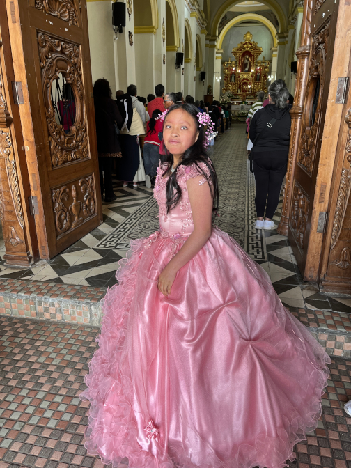 Sunday, July 23, 2023 - Sisa's QuinceañeraWe woke up at 8 a.m. That's also what time Yupanki and Antonio got home from last night's gig! They would be tired today! It's a good thing that Sisa came home at 10 o'clock last night so that she could at least get some rest before her big day.There was still no running water this morning, so we took sponge baths. Friends and neighbors came to the house with buckets of water to assist with cooking for the party. (Running water goes out from time to time, and people prepare for it by filling their outdoor sinks with water, filling water tanks, etc. So although nobody in the community had running water today, some of them had water reserves that they could contribute). Aida and Sisa helped me to get dressed. The elaborate Otavaleña dress for women is way too complicated for me to dress myself, as it involves two layers of wrap-around skirts ("anakos") which have no fasteners except for two woven belts ("mama chumbi" and "wawa chumbi") which are cinched tightly around the waist. These must be very precisely positioned, because if your under layer sticks out at all below the top layer of anako, it is an indication that you are a loose woman on the prowl. So I always need lots of help! They tied a sash ("fachalina") over one shoulder, and it covered part of my new blouse. They wrapped my hair in a woven hair tie ("cinta"). They put my necklace ("walca") around my neck, and wrapped long strands of coral beads ("maki watana") around my wrists. I wore espadrilles on my feet, and a piece of cloth ("uma watarina")on my head. It was a process! Craig got dressed in his white shirt, white pants, poncho, and hat. The men's clothing is a lot simpler! Cousin Celestina came over to help Sisa with her makeup and hair. We were surprised that the yard gave no hint that there would be a party here in an hour or two. There was no tent, no chairs...it just looked like any other normal day. The car was supposed to come at 10:30 to take us to the 11 o'clock Mass in Cotacachi. It arrived at 10:50. They still weren't ready. Craig and I were seated in the car waiting for the others to arrive. The driver joked that gringos are always on time and Ecuadorians are always late. They were finally ready, and Sisa squeezed into the front seat of the car with her huge petticoat. There wasn't even time to take photos of her at the house because we were running so late. Aida, Nena, and Kuri squeezed into the back seat with Craig and myself. Antonio would be following later on his motorbike. Yupanki and Shina had stayed home (Yupanki to try to get a little bit of rest, and Shina to help with preparations). It was a mad dash to the church and the driver leaned on the horn several times to get us there as quickly as possible. We pulled up in front of the Iglesia La Matriz and hopped out of the car. I quickly snapped a couple of photos of Sisa in the sunshine before we headed up the stairs. She looked beautiful. Our little girl was all grown up. We entered the large carved wooden doors of the church at 11:05 to find that the church was absolutely packed. There was nowhere to sit. The deacon came out and led us up to a bench at the side of the altar. Aida was worried that Antonio wouldn't know where to find us when he arrived, but the deacon made sure to fetch him and bring him up to where we were seated. The Mass was very nice, and the priest called Sisa up during the homily. Then he had her kneel and blessed her, and had Antonio, Craig, myself, and Aida bless her as well. The priest gave us hugs during handshake time. Then after Mass, he blessed us with holy water. He and the deacon couldn't have been nicer and more welcoming. After Mass, we got a bunch of photos in front of the church. We and some others got a camioneta back to the house. We were led to the back yard, which had been transformed since we left. Chairs had been delivered and were set up between the house and the guest houses. A nice little head table had been set up next to our casita, along with some quinceañera decorations. There was no tent, but the weather was sunny, and the roof overhang provided some shade. Unlike previous baptism and confirmation parties, this one was on a Sunday. Because of this, it was an afternoon party, and wouldn't go on until the wee hours of the morning. There was also much less alcohol consumed than at nighttime parties. The crowd was smaller too, mainly family and close friends. Chasqui Ñan, Antonio's traditional Andean musical group, provided the music. They also had a dj set-up to play some recorded music. A beautiful cake (5 round tiers plus a rectangular cake) was delivered. It was decorated with pink frosting as well as red and white roses and baby's breath. As Shina's birthday had been the previous Wednesday, the cakes were for both Sisa and Shina. The large rectangular cake had Sisa's name on it, and one of the round tiers had Shina's. There was a receiving line, and Craig and I took the presents from Sisa and piled them around the cakes at the head table. Nena was playing with another little girl around her age. At one point I caught Nena with frosting all over her face, and I noticed that one of the cakes had its frosting disturbed. When I confronted her, she just pointed at her friend. The friend had a look of "I didn't do it!" and I told Nena that I could see the frosting on HER face, not her friend's. Her response was to point at her friend again. We had maize soup, chorizo, chicken, potatoes, mote, steak, and cheese for lunch. While we ate, Sisa asked Craig if he would dance with her. Craig said that he doesn't know how to dance, and asked what type of dance she meant. "A waltz," was her reply. Craig DEFINITELY doesn't know how to waltz. He asked her if she knows how, and she admitted that she doesn't. He said that he would absolutely dance with her if she wanted to, but she would have to be patient with him. And it wouldn't be a waltz. Craig and I joked with one another t