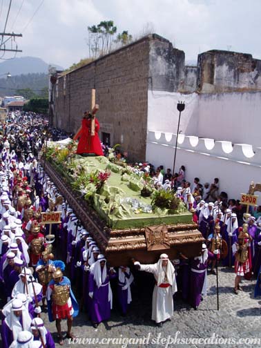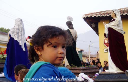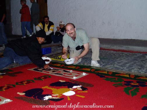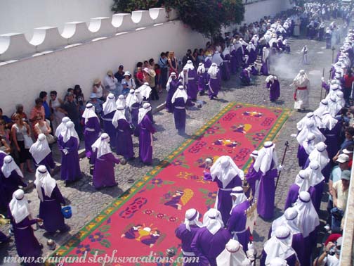 At 4 am we were awoken by the pounding of drums. We thought that maybe it was in celebration of the finishing of the carpet so we threw on some clothes and went outside. It turns out that the carpet wasn't yet complete, but it was well underway. Lots had been done but a few stencils still needed to be placed. Marco saw us and smiled. He asked in Spanish if we slept much as he noticed us there til very late and then again so early in the morning. We laughed and said no. He asked how long we were in town, etc. He then asked if we wanted to help make the carpet! We couldn't believe it. Craig got set up with a plastic spoon and some purple sawdust. When he was done with the purple, he asked if I could help, and Marco said yes. So I did some red triangles. We were so excited that we got to participate!! The carpet was finished at around 5:15 am. It was rather anticlimactic since we had expected some type of fanfare. But people just seemed tired and relieved to have finished. We headed to La Merced for the 6 am procession. On the way there we passed many other newly-finished or nearly-finished carpets. One little boy was asleep in a wheelbarrow while his family completed their sawdust carpet. We arrived outside the church entrance just before the float emerged. It was a huge float being carried by 80 people, with 50 different change-ups throughout the day. There was an adorable little girl sitting on her parents' shoulders, watching the procession in wide-eyed wonder. After the procession passed by, we walked back for breakfast at La Fuenta. Craig had huevos rancheros again and I had the the Americano (scrambled eggs and bacon). I was exhausted and we went back to the hotel for a nap. It was only 9 o'clock in the morning and yet it felt like late night. On the way back to the hotel we were accosted by a little girl who called us names for not buying something from her. We took an hour nap and were awoken by the sound of a brass band at around 10:30 am. We rushed downstairs to the balcony, smelling incense all the way. We were hoping that the procession hadn't passed in front of the hotel yet. We got to the balcony just in time. We had a great vantage point as the procession approached the hotel. It's hard to describe, but I felt close to tears as the procession trampled the carpet. The fact that everyone had worked so hard on the carpet itself, and that the penitents were carrying such heavy floats really moved me. We ran into our young friend from yesterday, and we had a nice conversation. Her name is Maria Jose and she is from Merida, Yucatan. She is 14 years old. She was visiting Antigua with her grandmother for Easter. She invited us to Merida and said that her house was our house. She was so sweet and genuinely enjoyed practicing speaking English with us. She was very good at translating ideas even when she didn't know the proper words. Then we saw Marco and he smiled and shook our hand. He formally introduced himself to us while pulling out a set of keys. He then invited us through a secret door up to the roof for a fantastic view of the city. Maria and her grandmother came up to the roof with us as well. We had a great chat with them and then went back downstairs and met up with Gerry and Judy. We went with Gerry and Judy to Quesos y Vino for lunch. Craig and I split a lasagna. It was very good. Then Gerry went back to the hotel and we went with Judy to Nim Po't for some shopping. We bought a little Maximon statue, a hacky sack for our nephew, some little dolls, a head kerchief, etc. We went back to the hotel and showered, getting ready to meet everyone at 3:00 for a procession. No one met us at the planned time, but luckily we ran into Beverly and David who told us that everyone else had decided not to go to the procession after all. It was kind of a shame, because it was Good Friday and after 3 pm all of the people in the processions would change their robes from purple to black. Fortunately we did see some of these processions from a distance but we didn't bother getting too close and into the crowds. We looked for a place to download our photos in case of a camera disaster but had no luck at the photo places. But we went to the Funky Monkey expat internet cafe (literally right next door to our hotel) where they served beer, etc. We sent and received email, and it turned out that they could download our pictures for us. It was kind of comforting to be in there at that time. They were playing everything from Ray Charles to old Black Sabbath music. We went back to the hotel and met up with the group at 7 o'clock. The stations of the cross were lit up and they were processing around the Parque Central. We walked to a very nice hotel named The Elton and were about to be seated indoors. It was quite stuffy and hot inside so they brought us out by the gorgeous pool with floating candles and flower petals. The drinks were very expensive here. A single drink cost more than some of our meals so we decided not to stay here for a night of dinner and drinks. Here we met up with one of Andre's friends who was very nice but unfortunately we couldn't recall his name later that evening and it never made it into our journal. From there the whole group headed to a strange combination of Argentinean steak house and Chinese restaurant, which was called Taurito Pinto/Lai Chi. The waiters only spoke Spanish and we were having a rather difficult time trying to communicate with them. I ordered white wine and they told us they didn't have any. Frustrated trying to get wine I simply ordered bottled water. They told me they didn't have any of that either(?!) So they brought me a small expensive bottle of red wine instead. Craig and I each got beef shish kebab. It was delicious, and there was a ton of food. We headed back to the hotel and sat up talking by candle light with our new Maximon statue set up like a little table-top shrine. |