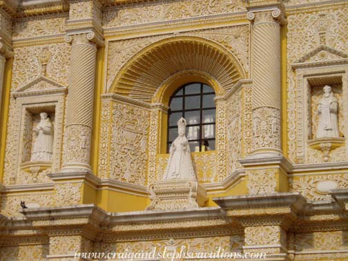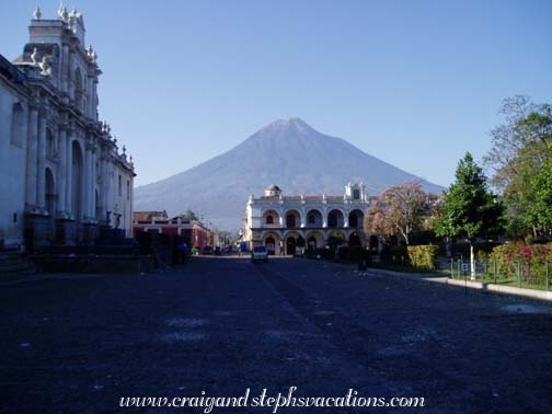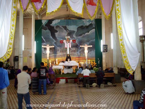 We woke up at 6:30 am and headed to La Fuenta for breakfast. Marcia had left for home bright and early this morning. Craig got an omelette and I got panqueques again. We also had a nice side dish of cantaloupe and papaya. As always the fruits here were incredible. After breakfast we briefly stopped at the hotel where Andre picked us up. Margaret and Tracy rented mountain bikes and went with a group to the surrounding hillsides but we had planned to go to a coffee finca, a music museum, and a butterfly farm, but when we arrived we discovered they were closed for the holiday weekend. So instead we continued down the road to see some of the villages on the outskirts of Antigua. As we climbed higher and higher up the road we ended up in Santa Maria de Jesus, a small Mayan town on the mountainside above Antigua. We went inside a nice church that was festooned with brightly colored banners. The tile flooring was very ornate and once again we were reminded of how nice many of the churches are even when in a town where many of the buildings look a bit worse for wear. There was a small Ferris wheel and a Teletubby amusement ride in the center of the town. It was very interesting to see such a mix of Maya folks in traditional clothing surrounded by big amusement rides. After a short visit we then went to Ciudad Vieja where there was a big white church with yellow trim and some men playing basketball in a court across the street. In the distance was a clothes washing pavillion where a few women had gathered doing thier laundry. Suddenly a large bus pulled up making it the perfect time for us to move along.