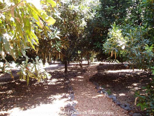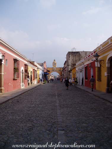 Next we went to Valhalla Experimental Station, a macadamia nut farm that is run totally organically. To reduce dust they cover the parking lot with macadamia nut shells, which do not decompose. Although the ground here is very dry, a layer of mulch retains the moisture. Macadamia agriculture absorbs a lot of carbon dioxide. Lorenzo ("Larry"), the man who runs the place, gave us a tour. The size of macadamia nuts can vary widely, so they had created a contraption which used a flat tire to husk the nuts. It looked like something straight out of "Junkyard Wars". Then the nuts are placed on a metal grate and rolled downhill. Depending on the size of the nut, they fall into sorted bags. Larry showed us how all of the organic waste is eaten by worms. He then let us taste some of his macadamia nuts. They were very rich and we were already wondering when we could buy some for ourselves. He then let us try macadamia nut oil on the back of one of our hands and macadamia nut cream on our palms. The scented cream is very nice and not filled with all the chemicals that you find at home so I bought a little to bring back with me. We also bought a package of unsalted nuts, we couldn't resist. Larry did a little makeover on Ann with the macadamia nut products and we were joking about how Ann was glad to be here instead of on the back of a mountain bike as it was a little bit hot in the sun today. Just after we said that Tracy and Margaret appeared on their mountain bikes. Apparently we were in a rather popular stop afterall. It was pretty funny and the timing of it all made us laugh. Then we continued on to San Antonio Aguas Calientes where locals were working on floats for the upcoming processions in the church. We saw a fountain in the center of town as well as a large church that seemed to be under a bit of construction. As we arrived the church bells were attempting to ring but were somehow disabled so it simply kept making a loud clicking and banging sound. It was sort of amusing at first but it seemed like it would never stop. We proceeded into a little textile co-op but by this time Craig and I had bought all we planned to so we would have preferred spending a bit more time in one of the little towns meeting the people rather than being hustled to buy more things we would have to carry with us on the second half of our journey. On the way back to the city we stopped at a gated community in Antigua where Andre's friend owns a house and where Andre is currently staying. We kept hearing about the place so we were all curious to see what it was like. On the way there we came very close to hitting a motorcyle with a man and his son on the back. It was very scary and way too close for comfort. Fortunately Andre was able to miss the bike and after a brief pause, we continued to our destination. Once we arrived at the house we could see that they are doing a lot of construction and hope to rent the house out to tourists when the owner isn't using it. It was a gorgeous house with cathedral ceilings, fireplace, wooden religious icons, a pool, and beautiful grounds. It is clear that there must be a pretty large group of people working on the property to keep it looking so beautiful. The owner also purchased the lot of land next door so there is a large yard with nice grass making the whole place very large and like a little oasis just outside the city itself. We got back to the hotel at around 1:15 pm. Gerry, Judy, and Ann went with Andre for cebiche but Craig had a little bit of a headache and didn't want to spend a lot of time in the van again so we rested in the room for a short while. We then headed to Frida's for fajitas and margaritas and spent some time discussing the trip and how much we had already done in the past few days and how much we still had left to go. We walked to La Merced and got some pictures as the sun was starting to get low in the sky. On the way back to the hotel we went to the Funky Monkey for a quick email check as we figured this would be our last chance to see if anyone had replied to our email postcard. Once at the hotel Craig showered first and I ended up having to bail out the shower so that it wouldn't overflow before I took a shower. By this time the shower drain was getting a bit old and we were happy to be moving along and yet sad at the same time. We packed up our stuff, collected our second batch of laundry, and met the group at 7. We went to the Antigua Vineria for drinks and supper. They had a really neat candle-lit ambiance, and the walls and ceilings were completely covered with photographs of patrons. We were going to sit inside but it was way too stuffy and warm. So we ended up going out to the deck where we were the only party. It was very nice being up here as we felt like it was our own backyard party on the rooftop. This was the first bar we had been to where I could get a malt beverage (Bacardi Silver). Craig had Gallo beer we all had a lot of laughs. It was a very nice way for the group to spend their last night together. Andre told us the legend of Maam and finally at around 9 o'clock we ordered a blanco quatro quesos pizza. It had somewhat funky crust but really good cheese. After a few drinks we broke up at 10:45, said our goodbyes to Andre on the street in front of the restaurant, and headed back to the hotel. |