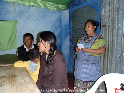 We enjoyed our pancake breakfast. Paola was working on her homework. The kids played with the computer and the camera. After breakfast, Craig played soccer with Eddy in the courtyard. Aracely typed on the computer in approximated spelling that she wants a computer, dog, and a turtle for her birthday. It was great to see her writing English words phonetically. It seemed like a good time to do an activity with Aracely and Eddy. We presented them with some "reusable sticker books", which were like ColorForms we used to have when we were kids (little pieces of plastic in various shapes which can be stuck onto cardboard to create various scenes). We went outside into the hallway between the guest rooms and sat on the floor. Aracely played with the more girly themed set (dress up, ballet, etc.) while Eddy played with one which featured animals and dinosaurs. Aracely carefully picked up only the pieces she needed, and she placed them very deliberately onto the background. Eddy was interested and attentive but not as confident. He asked me where to place each and every item, and he insisted on using every single sticker from the page. After he placed each one he said,"Veddy Goooooood," in what seemed to be an imitation of my praise for him. He tried to place way more stickers than would fit on the background, so he ended up layering the stickers on top of one another. He sat for a good hour playing with rapt attention. This bodes well for him to start preschool in the fall. Yasmin and Yoselin came home from school and Aracely showed them the sticker books. we all played together, and then Paulina called us to lunch. We unwrapped tamalitos from the corn leaves Paulina had bought at the market yesterday. They were served with black beans and rice, and we had fresh pineapple juice to drink. After lunch we played with the computer. Eddy loves the New Year's video which feqatures all of the kids, but loses patience with some of the other videos. Aracely used Notepad to type that she wants a dog for her birthday. We used this as an opportunity to talk to her about Terry, their dog which had recently passed away. She said in English, "I want to show you where we..." she didn't know the next word. She made a motion of slitting her throat and rolling her eyes back in her head. "Buried him", we suggested. She nodded. Craig asked if they put a cross on his grave and she said yes. She said she was going to get her shoes and then she would take us there. She disappeared and then re-appeared a couple of minutes later. She led us out in front of the chicken coop and gestured at a hastily drawn cross scraped in the dirt. She had obviously just done this. She tried to explain in English that she was sad and showed us where they had found him dead, next to the stairs in the guest building. We told her about our cat Brownie dying, and how we were sad and missed her. This prompted her to tell us about her friend Ilene, whose cat had also died. Humberto had told us that her friend Ilene from school had just moved away with her family to Belgium. We took this opportunity to talk with her about this. She brought us into her parents' room and showed us a poster that Ilene had given her. It was a red rose in the rain, with a Spanish poem about being friends forever. After a few uncharacteristically solemn minutes, Aracely was back to her cheerful self and we went back into the dining room. We showed Galapagos and Mali videos to Paulina on the netbook. Yoselin was doing her homework at the table. Paulina got out Aracely's schoolwork from her past two years of school for us to look through. We had seen her excellent report card, and we were interested to see what kind of work she was doing. We read through her word journal, with its English spelling words and verb conjugations. She also had many math worksheets: fractions, Venn diagrams, graphing, patterns...and the most impressive worksheet with math problems like 18 - ___ = 13. That's basic algebra! In kindergarten. We were very impressed. We had heard some rumors that her school might be closing or merging with a nearby school due to financial constraints. We hoped that this wouldn't be the case, because Aracely was obviously having such a great experience there, and we don't want that to change. Paulina was playing with Eddy with the sticker book. He was very attentive to what he was doing. Once again we noted that he was definitely showing signs of readiness for preschool in a couple of months. We spent a long time looking through Aracely's school papers. The early childhood education major in me is floored by the ambitious curriculum, and to think that Aracely is learning it while immersed in English is even more impressive. Paulina helped Yoselin with her homework. We noticed that they were reading about Darwin and the Galapagos. We explained to Yoselin that we had been there, and we showed her a picture of us next to a statue of Darwin. We also played her the videos montages that we put together for each of the three islands we had visited. Yoselin was excited by this connection to her lesson. Aracely, Eddy, and Yasmin played with the sticker books in the bedroom. Vanesa came home from school and hung out in the office. Humberto got home from work at around 7 o'clock. He gathered everyone together and announced that we would be going to the kids' Auntie Isabela's restaurant for tacos. Just as Humberto was shutting off the lights in the house, the whole neighborhood's electricity went out. Aracely, who had bee holding my hand, was scared. They got a flashlight and we walked down the alley. We stopped at the office to pick up Vanesa and the lights came back on. We walked down to the end of the street and turned down Rancho Grande in the direction of the lake. Paola was sitting on the curb with a friend. She didn't acknowledge any of us. We wondered if she would end up eating with us. We walked a couple of buildings down and arrived at Isabela's restaurant. As we ent