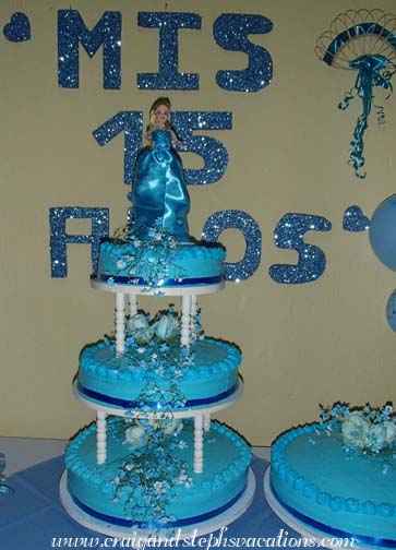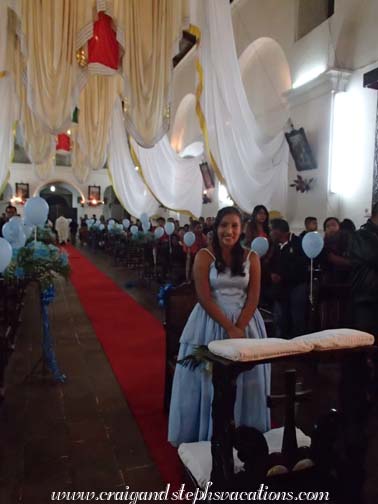 Feliz cumpleañanos, Yasmin!! Vanesa and Yasmin finished up the centerpieces, adding balloons, marshmallows, a little decoration shaped like Yasmin's dress and curly silver decorations. Breakfast was a quick bowl of cereal as everyone was busy with last-minute party preparations. The kids' cousin Sandra is the family's party planner extraordinaire. She had taught the girls how to make the basket centerpieces, and we remembered how much she had helped with Paola's quinceañera. She arrived and immediately started construction on the entrance archway. It was a beautiful, sunny day. The party would take place on the second floor of the guest building. There were still guests in two of the rooms this morning, but they would be checking out long before the party. We decorated the second floor, scattering pine needles on the floor, setting up plastic tables and chairs rented from a party store right next door to Humberto's office, hanging glittery signage, balloons, and ribbons. Paola's boyfriend Jeremias helped with the preparations as well. It was looking so festive! Olga cut up fruit to make the two beverages: nonalcoholic ponche, as well as rum punch. Yolanda and Juan came over with Junior and Fatima. In addition to all of the party prep, Paulina and the women prepared lunch for everyone who was helping. We had grilled steak with salsa, guacamole, black beans, tortillas, and fresh pineapple juice. Yolanda delivered the cake topper and bouquet that she made (this family is talented!) The topper was a doll wearing a gown which was identical to Yasmin's. The bouquet contained white roses speckled with blue, and small stalks of wheat. Craig and I got showered and dressed. Mass was at 6:30 p.m., and Humberto had said that they would be trying hard to leave at 5:30 (the family is rarely early for anything, in accordance with their culture). We thought this was unlikely, and Humberto laughed and he said that he knew they wouldn't be ready that early. Nonetheless, we didn't want to be the bottleneck, so we were ready soon after 4 o'clock. When Steve got out of his yoga teacher training class, we talked with him via Skype. He gave us the update on his awesome experience, and we gave him the update on ours. Aracely came in and was able to talk to Steve, which was very cool. She would later hug Craig and say, "that's for your brother. Give it to him when you get home." Eddy also said hello. Yasmin decided at the last minute to go with a more conservative dress than the one she had originally selected. The color was basically the same, but the style was more conservative. so Yolanda did some last-minute alterations to the cake topper so that it would still match. The girls went off to an aunt's house and came back with their hair styled in curlers and waves. They got dressed for the party. Aracely wore her high heeled wedge boots. It reminded me of prom or wedding preparations in my own life. More extended family members started to arrive. Paulina's sister Estela arrived with her youngest kids Loren and Michelle. We were amazed by how tall Loren ("Lori") had become. We first met her when she was 4 years old. It had been a couple of years since we have last seen her, and she is now 10! Michelle was an infant the last time we saw her, and now she is a vivacious, tiny, happy, 3-year-old. Despite not having any idea who we were, she immediately gave us big hugs and chatted with us. Olga's kids Pamela, Chilo, and Allison Margarita arrived. Allison Margarita was Craig's buddy when she was a toddler. She used to hang on his every (English) word, staring into his eyes and nodding as if she understood everything he said to her. It was adorable. They picked up where they left off a couple of years ago, with the now 6-year-old cutie giving us both huge hugs. Fatima came back wearing a beautiful burgundy and black gown. A crew of disc jockeys arrived and started setting up in the "disco" room. They had a variety of speakers, light rigging, lasers, strobe lights, etc. Paola helped Yasmin to do her makeup. It was 6:15 and we hadn't left for church yet. Humberto went to get the van to drive us all. I was waiting for Yasmin to emerge from her room to photograph her in her dress. I was with Vanesa and everyone else had gone out to the street. Humberto called for us and Vanesa and I hurried to the van. Yasmin was already seated inside, looking beautiful. How had I missed her? And how was I, who had been dressed and ready for the past two hours, one of the stragglers everyone was waiting for? Curious. We drove the short distance to Iglesia San Francisco de Asis, arriving just moments before Mass. I took a photo of Yasmin standing outside the church. She looked gorgeous in a light blue satin gown with spaghetti straps and some monochromatic embroidery on the bodice. Her sparkly silver peep-toe pumps were just visible below the tea-length hem. The back of the dress was bustled. Yasmin looked radiant. We entered the church, which was festooned with white, green, red, and gold fabric from Christmas. Vanesa and Junior had also come by earlier to decorate the pews with light blue balloons and ribbons. Yasmin, her parents, and Craig and myself walked in the opening processional. She looked so beautiful and grown up in her light blue gown. I had tears in my eyes as we walked down the aisle with her. We first met her eight and a half years ago, and it is amazing what a lovely young lady she has grown into! It struck me that soon the girls would start getting married...Saint Francis, the namesake of their church, is also the namesake of the church where Craig and I were married 17.5 years ago. Yasmin was seated in a fancy wooden chair with its own kneeler in the center aisle in front of the altar. We sat in the front pew. There was a brightly lit nativity scene to celebrate Christmas and Epiphany. The musicans were set up right in front of us: a keyboard player, drummer, and three singers. All were Mayan. When one of the singers 