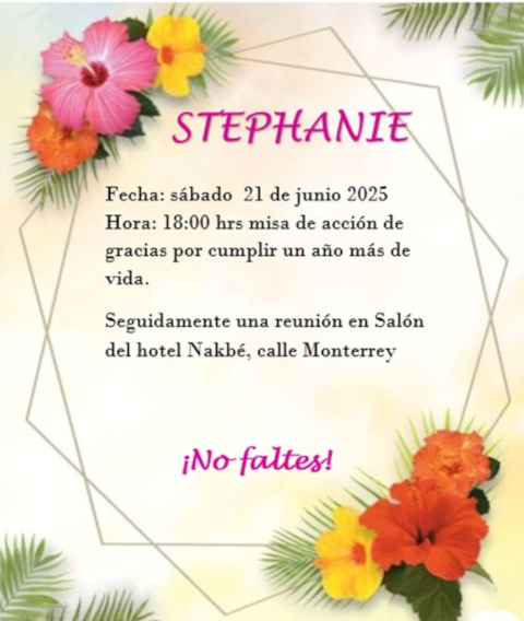 ![]() Yoselin and Paola made this invitation for my surprise party and sent it to the family. They invited 100 people, and around 60 attended. Saturday, June 21, 2025 - Steph's Surprise 50th Birthday PartyBeing Saturday, we slept late this morning. When we woke up, we had pancakes, fruit, coffee, and juice for breakfast.Paulina and Humberto went to the market and came home with sacks full of pineapples The kids' cousin Pamela came over and helped Paulina to prepare lunch. Humberto had told us ahead of time that with all of the June birthdays (mine, Ian's, Humberto's) and the fact that we hadn't gotten to see many of the extended family members in the past couple of years, we would have a party on Saturday the 21st. There would also be a Mass at the San Francisco church dedicated to us for our birthdays. Craig had asked if the family party that was happening tonight would be here at the house. Humberto had said that there wasn't enough room at the house (which is true, now that they rent rooms to tourists), so it would be at the nearby Hotel Nakbe, where Vanesa's wedding reception had been held. Yasmin and Yoselin used the pineapples to make piña loca. They cored the pineapple, cut the rings into bits, put them back into the pineapple, drizzled them with sweet red syrup, and sprinkled a hefty amount of Tajin spice onto them. They then put Takis Fuego chips into them. These would be edible centerpieces for tonight's party. Vanesa, Danny, and baby Emiliano came over. I fed Emiliano his bottle. Isabela's daughter Roxana came over as well. We had lunch: hamburger patties and fried eggplant. Most of the kids disappeared for a while with Humberto; we assume they were taking the pineapples to the party venue. We had some nachos and cheese as a snack. It started to pour, just as it had on Aracely's wedding day last year. We hoped that the weather wouldn't be too bad today, as we would be going to both the church and the hotel. Luckily, Humberto had the van and could drive us. We got dressed in our party clothes. We were grateful that Humberto had told us ahead of time that we would need nice clothes; usually we dress pretty casually in Guatemala unless there is a special event. The rain let up a bit by the time we drove to Iglesia San Francisco at 5:30 p.m. with Ian, Roxana, Paulina, Humberto, and Yasmin. The Corpus Christi multi-day festival was technically still going on in front of the church, but only three dancers were braving the rain, and the marimba musicians were under cover. As we entered the church we met up with Priscilla, Humberto's sister-in-law, and we sat with her in the second pew. Before Mass began, there was a little prequel where they read the prayer intentions, which included my 50th birthday and Ian’s 10th. During Mass, Vanesa, Emiliano, Yoselin, and Paola showed up and sat in the pew in front of us. I was blessed by the priest at the end of Mass, and he wished me a happy birthday as he used palm leaves to sprinkle me with holy water. We left the church and got into the van, but we had to wait a while for people who had parked blocking us in to leave. Paola took off on her moto to go to the party venue. We arrived at the Hotel Nakbe and immediately saw Aracely and Joel waiting outside. Paola was manning the door, handing out leis to everyone. We entered the hall, and several tables already had many extended family members sitting at them. I looked around and noticed big blue mylar balloons which said "50" hanging on the wall above three cakes. That is when it finally dawned on Craig and me that this was a surprise party for me. It wasn't just a family get-together to celebrate everyone's June birthdays, as Humberto had claimed. I was the guest of honor. Paola put a silk flower wreath lit with multicolored tiny LED lights on my head. I was absolutely floored. All of these people had come to celebrate my 50th birthday. There was a dj and the hall was decorated with balloons. The piñas locas stood as edible centerpieces on each of the tables. My immediate reaction was to thank people for coming, so Craig and I made the rounds to all of the tables, getting pictures of people and thanking them. We have been coming to Guatemala for over 20 years, and in that time have met a lot of the people in both Humberto and Paulina's extended families. As 20 years progressed, those families have grown exponentially, with kids growing up, marrying, and having kids of their own. Paulina's sister Estela was there with her kids and grandkids, including Laisa and her 4-year-old daughter Denora. Paulina's sister Olga was there with her daughter Odilia, Odilia's husband Wilson, and their little boy Bernardo. Pamela was with them as well. Humberto's cousin Sandra was there with her husband and their little daughter. Andrik was there and we got to meet his wife for the first time. They are expecting their first child together. Neli was there, as was Julisse with her husband Israel and two young daughters. Lety and her kids were there, and so were Soleyba and her kids. Heidi and Roxana were also there. Alison Margarita was there, 8 months pregnant, with her husband. And of course Humberto, Paulina, Vanesa, Danny, Emiliano, Paola, Yasmin, Yoselin, Aracely, Joel, Elsa, Eddy, and Ian were all present. There were countless others as well, whom we recognize by sight even if their names elude us. Humberto gave a toast to my birthday with rum and 7-Up. The catered dinner consisted of pepian, chicken, veggies, and rice with grape juice to drink. Everything was delicious! The pepian tasted wonderful, and the chicken was extremely tender. Little Denora was excited to talk to me, and she asked about a crown (some of the girls were wearing tiaras that said "Happy Birthday"). I had seen that some extra tiaras were laid out in a circle around the cakes, so I went to get her one. She was thrilled. Dessert was mole with bananas. Victor and Rosa arrived after they got out of work. As soon as they came in, they were