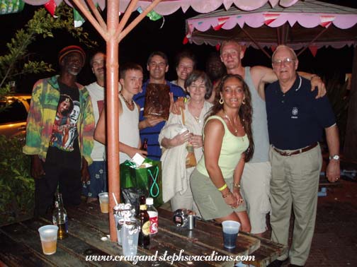At around 10 we landed at Anse Chastanet Resort (not affiliated with the Allen Chastanet who owns Coco Resorts). We checked in and were greeted by the manager of Scuba St. Lucia. He gave us vouchers for lunch and a soft drink, and split us up into groups depending on whether people were beginners, certified, etc. We were signed up for a "resort course", which includes instruction and practice with the equipment followed by an actual shore dive. We rented a locker for $5 US and stored our possessions. We put on wetsuits (which were optional). We then got into a small group and met our dive instructor, Victor, who has been diving for 40 years. He sat us down with our equipment and familiarized us with it. It seemed like a lot of information but I tried not to be intimidated and just absorbed as much as I could. We practiced breathing with the regulator, how to recover a dropped regulator and clear it out, how to inflate and deflate our buoyancy vests, etc. We learned hand signals for "OK", "Something is wrong," "Out of Oxygen", etc. Then it was time to hit the water. We were split up into smaller groups. Our group was just the five of us, along with Victor and one other instructor. We were each given weight belts, and the instructors helped to put our equipment on. We walked down to the water (the scuba tank was surprisingly heavy). When we got into the water, we put our fins on. I should have tried mine on beforehand. I discovered now that they were too small. I had a very difficult time jamming my feet into them in the water, but eventualy got them on. They felt precarious, though, as though if I kicked my feet too forcefully they would fly off. Victor asked us to descend in the shallow water. I let all of the air out of my buoyancy vest and descended a little, but wound up bobbing back up to the surface. I was just too buoyant. Victor pulled me under and kept tapping my legs. This was not a signal I knew and I didn't know what he was getting at. I started to panic and subconsciously held my breath (never a good thing). I popped up at the surface and asked Victor what I should do. He said that I was kicking my legs, and that I should just try to remain still. I tried, but still couldn't stay down. I started to get nervous because everyone else seemed to be able to stay down except me. I didn't know what was going wrong. Victor eventually adjusted my equipment and got me to descend. We practiced taking out our regulators,clearing them out, and reinserting them. We also practiced getting water out of our masks, and how to breathe with a buddy if you run out of air. All went well with the practicing and we swam around a little outcropping of rocks to the reef. I was very conscious of my breathing, and any time I would try to concentrate on something (be it equalizing my ear pressure, taking a photo, etc) I would instinctively hold my breath. I couldn't judge depth perception and had a hard time keeping track of the location of my body. I didn't want to inadvertently bump into coral, etc. I was still too buoyant and could float upwards at any point if I wasn't careful. Eventually I learned that if I exhaled fully and stood stone still, I would descend. I think I would have benefitted from a little more weight on my weight belt. I never seemed to be neutrally buoyant; I was either floating to the top or sinking to the bottom. But eventually I became more comfortable and was able to focus less on the mechanics of diving and more on my surroundings. There was some very interesting tubular yellow and green coral, brain coral, parrot fish, etc. Mike had a small hole in the butt of his wetsuit which was good for a lot of laughs. It was very peaceful once I stopped overthinking things. The light was filtering through the water, I was face to face with fish, etc. There was a really cool piece of coral that looked like a tree. The way it was lit by the sunlight was gorgeous. Unfortunately our photos didn't really capture the scenery. In fact, none of the photos from my camera even came out whatsoever. I kept checking my depth guage to see how deep we were going. I got to a max of 35 ft. I had to equalize my ear pressure often, but it was always easy to do and I wasn't ever uncomfortable. There was a drop off in the reef, and in the open water Craig saw some fish that he thought were small tuna. When our oxygen was at a little less than 1000 psi, we swam back to shore. I found it very difficult to walk out of the water onto the beach with my sea legs and the awkward weight of the tank on my back, the weight belt around my waist, etc. We got out of our equipment and were looking forward to lunch. We had the option of doing a boat dive in the early afternoon for an additional $50. It was tempting, but the first dive had really tired us out. We feared that a second dive so soon afterwards might be pushing it. We had had a really good experience thus far and didn't want to spoil it. So we decided instead to have a leisurely lunch and then hang out on the beach until it was time to return to Castries. We returned our equipment and then watched a beautiful sapphire and emerald jewel-toned hummingbird flitting around in the bushes. He even stopped to alight on a branch now and then. We handed in our vouchers and were seated at a table in the beachside restaurant. All of the tables were equipped with squirt guns, and Nicholas clued into this right away. The servers brought us complimentary soft drinks. The women were dressed in plaid, which we had learned was the traditional style for married St Lucian women. We attacked the buffet, and enjoyed the delicious spread, including pumpkin sweet potato soup, creole aubergine, cheesy bananas, braised goat, cooked-to-order fusilli w/ mushroom and onion cream sauce, creole bread, rice with spinach, and chicken. There were interesting condiments as well, such as spicy banana sauce, the devil's hot hot sauce, and fresh roasted garlic. The food was really delicious, and 