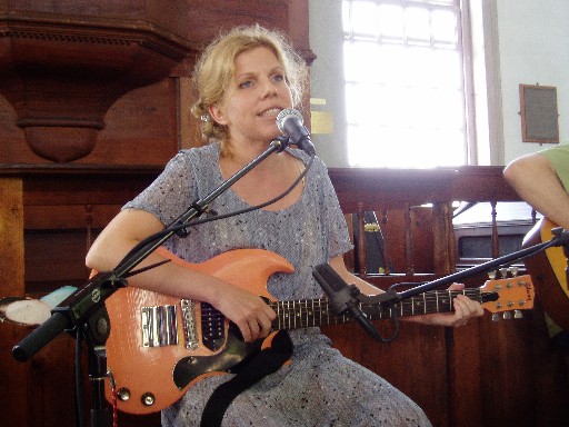 Friday August 15, 2003Rock in Rockingham was the brainchild of Gary Smith, owner of Fort Apache Studios, which recently moved from Cambridge to Bellows Falls, Vermont. Gary envisioned a weekend where artists and fans would come together in Bellows Falls for a weekend of music and appreciation of the surroundings. Package deals could be booked with area bed and breakfasts that included admission to the weekend's events: Friday night was "new faces night," a celebration of new artists at a local bar. Saturday was a day-long music festival held in a tent by the canal. Sunday was a scenic train ride follwed by a concert by Tanya Donelly and Kristin Hersh held in one of the nation's oldest meetinghouses. Craig and I are huge fans of Kristin and Tanya, and try to make it to all of their area performances. This sounded like a great weekend of musicians and fans coming together, and we bought tickets for us and Craig's brother Steve to attend.We left home at about 7:00 pm. Rt. 12 was washed out near Keene, NH, so we had to go all the way out to Rt. 2. We arrived at our B&B (Horsefeathers) at around 9:30. Bodo and Elke were our hosts. We were shown to our room on the second floor, which had a queen and a twin bed. It was the Farm Country room, and it was descorated with various antiques and farm implements (one being a large wrought iron hook). There was a welcome package from the Rock in Rockingham folks. It contained 5 promo CD's, Green Mountain Gringo chips & salsa, and loaded dice that were a promo item from Belly's album King. We decided to head down the road to the Everyday Inn to Rick's bar for the "new faces night". It was very loud in the actual room where folks were performing, so we ended up sitting at a table next to the bar. We could hear the music and it was a great spot for people watching. Tanya Donelly and husband Dean Fisher were there, and they sat in on Elizabeth Steen's set. We ran into Brad and Amie (whom we hadn't seen since the Camper Van Beethoven concert at the Middle East). We had a couple drinks and then hit the road around midnight. Saturday August 16, 2003Breakfast is served between 8 and 9, so we got up and showered and were downstairs by 8:15. Bodo and Elke served us breakfast - a fruit salad with fresh-from-the-garden juicy fruits and a piece of gingerbread-type biscuit. We had oj and coffee, and then were served farm fresh eggs with bacon and toast. It was delicious! After breakfast we wandered down to their chicken coop and sat for a while watching the chickens and admiring the grounds (a small pond with fish and bullfrogs). Then we drove into town. Bellows Falls is very picturesque and quaint. We really liked the retro welcome sign. We sat on a bench on the sidewalk until it became too hot in the direct sun. Then we wandered around into a couple of stores, sat down on the curb across from the Miss Bellows Falls Diner, and then wandered down to the canal where the concert would be taking place. Doors were scheduled to open at 1:30, and people were starting to line up slightly after 1. We got into line and could hear sound checks. They were running a little behind and didn't end up opening gates until around 2. We snagged seats in the second row of the tent. Steve got some popcorn chicken, and Craig and I got a neat meal which consisted of a veggie crabcake on a bun, pasta salad, cuke salad, a brownie, and juice for $10. It was delicious! The whole show was powered by solar panels. First up was Blake Hazard. We had seen her before and weren't all that impressed, but today we enjoyed her. At one point the train passed by and blew its whistle (about 10 feet from the tent) during her set. She had guitarist/boyfriend John Dragonetti with her. Next was Josh Ritter. He was dressed in a black suit and red Chuck Taylors. His bassist had one of the longest mustaches I've ever seen. His set was really good. The rocking parts were reminiscent of Tom Petty and the Heartbreakers. There was a certain amount of innocence in his songs...he made a joke about being a 26 year old whose songs are all about asking girls to the prom. After his set I bought a CD and he signed it for me. I told him that I thought they had a Tom Petty and the Heartbreakers vibe, and he seemed flattered. He gave me a hug and kiss and signed a CD to Craig and me: "Here's to the Heartbreakers everywhere." He's from Idaho and said he would be playing Boston at the beginning of September . I told him we'd check him out. Just as the Stone Coyotes were hitting the stage I walked back to my seat and got stung right on the ass by a bee while I was walking. It made for rather an uncomfortable rest of the day sitting on my sting, but it was ok. Craig and Steve were talking to the people next to them when I returned: Coelynn and Genevieve. The whole weekend you kept running into the same people over and over again, and we enjoyed Coelynn and Genevieve's company. Stone Coyotes rocked. I found it hard to believe that the bassist was the son of the drummer and stepson of the lead singer. The place went wild for them. They played a good set. Then Juliana Hatfield was up. She was the only performer who seemed to be bothered by flash photography, so we were told that we couldn't use flashes for her set. She got up there with gum in her mouth, removed it and stuck it to her set list after the first song, and played a very uneven set which she seemed to cut short. She seemed rather flustered, and it was the best set I had seen by her. After that was Kristin Hersh. She did a short set but it was fantastic - she even did "The Letter" which we have never seen her perform prior to this. We could see her husband Billy holding their 9-month-old baby Bodhi in the "backstage" area while she performed.The whole low key family vibe of the show was very cool. Andrew Bird accompanied her on violin for several songs. Apparently, he had closed out "new faces night" last night after we left, and everyone said he had been fantastic. Last b