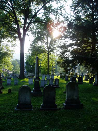 Several weeks ago we found out through Tanya Donelly's web site that she would be recording a live album in Bellows Falls, Vermont. As we had attended Rock in Rockingham there last summer, and had such a good time, we decided that this would make a nice weekend getaway. There were three recording sessions: Friday night and two sets on Saturday. We were unable to make it to Vermont for the Friday night show, so we bought tickets to both Saturday night shows. We made a reservation for Saturday night at Horsefeathers, the excellent bed and breakfast where we had stayed last year. We left home around noon on Saturday. We were able to take Route 12 this time (it had been washed out last year), and it seemed significantly faster (and more scenic). It was a very hot and humid day, one of the few really summery days we have had this summer. The drive took us 2 hours and 15 minutes. We went straight to Horsefeathers, where we checked in to our room. It was called "Our Queen" and was on the ground floor. It had a queen sized bed, nice private bathroom, and a little private deck with a sliding glass door. There was an interesting arrangement of antique keys hung on the wall. We said hi to Elke and Bodo, the proprietors, and we met Darrell, who had driven in from Cleveland. He had seen the Friday night show, and he gave it a glowing review. We also talked a bit about blues, and how Robert Lockwood Jr. plays in Cleveland every Wednesday night, and many people sit in with him. We freshened up and then headed into town to find some food. We parked right in front of the Windham, an old brick hotel which has been converted into storefronts. On the right hand side of the building was an area that has been converted to a recording studio/performance space. We ended up talking to Ezra, the sound man. He told us about the recording process, etc. Tanya and her band were rehearsing inside, and we could vaguely see and hear them through the windows. We wandered around and tried to find someplace to eat. It was around 4:00, and not much was open. The town was definitely very sleepy for a Saturday afternoon. Never one to pass up a good old-fashioned diner, we stopped in at the Miss Bellows Falls Diner. There weren't many people there when we arrived, but soon it was bustling and filled to capacity. Craig and I got iced tea. Craig had a nice cup of clam chowder to start things off, followed by chicken breasts with mashed potatoes, zucchini, and summer squash. I had meat loaf with mashed potatoes and gravy. The meat loaf was delicious! Top it all off with a basket of rolls and we were all set. We watched the regulars for a while and soaked up the ambiance of the diner while we finished our iced teas. It was an interesting place to people watch and we couldn't help but think of a few Tom Waits songs that seemed highly appropriate. A sign proclaimed it to be "Worcester Diner Car No, 771, built in the 1920's." After we finished eating, we wandered around downtown. We went into a sporting goods store, and by then it was 5:30. Most of the other stores were closed, so we took a walk up to the Immanuel Church and around its cemetery, which had graves from the mid-1800's to the present. The church clock struck six o'clock and played some nice chimes. Several minutes later a church down the street struck six and played an extended melody.It was very peaceful and picturesque in the cemetery with the setting sun so we took a few photos. At around 6:15 we walked back downtown. A local teenager sitting on a park bench talked to us a bit about the town and suddenly somehow the conversation turned to Jesus. We took that as our cue to head across the street to the venue. We ran into the usual suspects, Coelynn, Genevieve, Darrell, Lisa, Vicki, etc., hanging around outside the door of the Windham. We chatted with everyone. A little while later, someone came and started passing out the will-call tickets. At around 7:00 they let us in. The room was very small but elegant. This was actually the lobby of the old hotel and much of the ornate woodwork was still in place. There were blue velvet curtains on the windows and a blue velvet curtain separating the main room from the bathroom area. There was a bar in the rear corner of the room. There were six rows of chairs set up, accommodating around 50 people. There were a couple of tables in the back of the room. We were seated in the third row.